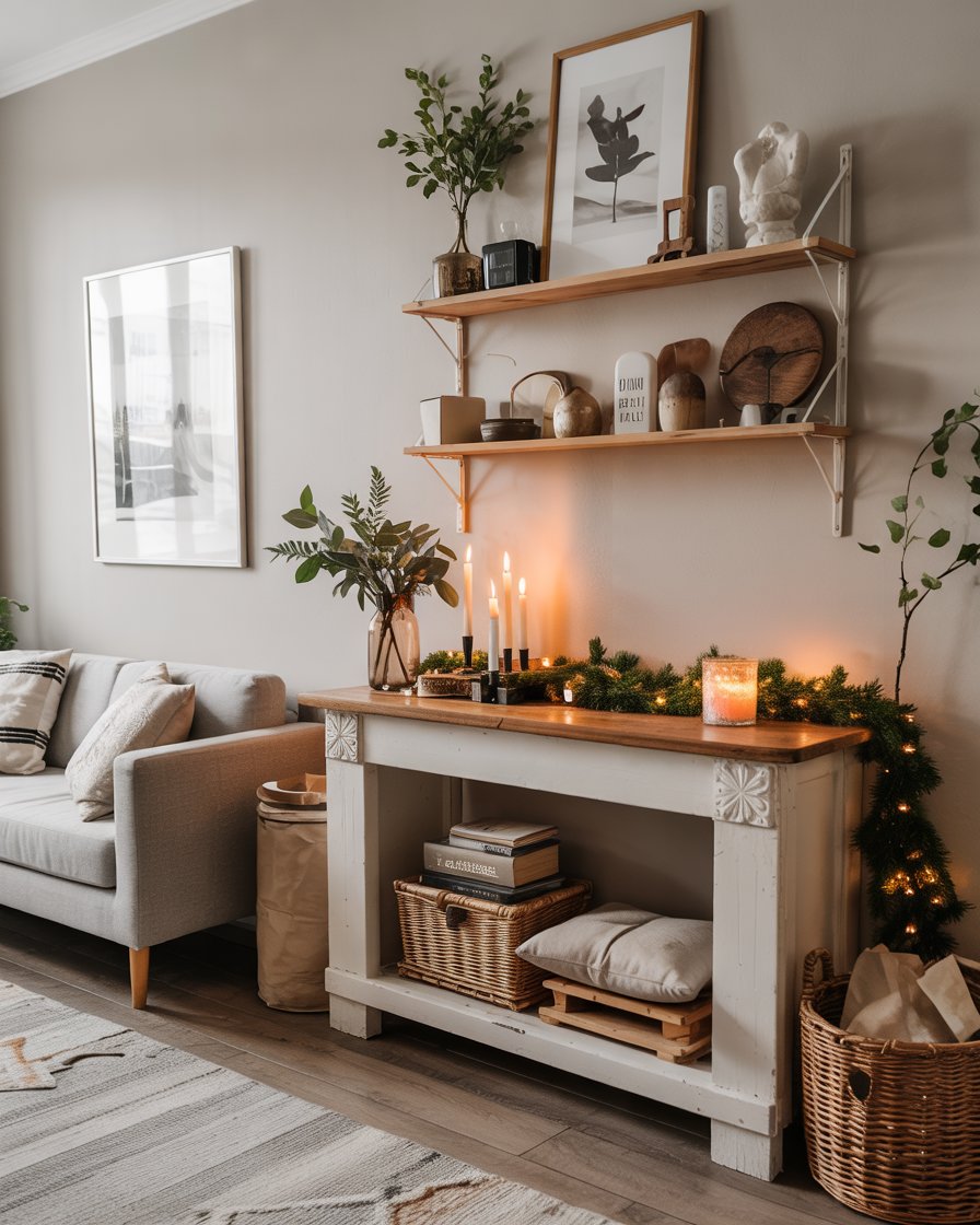Not every home has a mantle, but nevertheless, a focal point can be created. Use creative shelving or vintage consoles as a display zone for rustic decor, garlands, and candles. Perfect for living rooms apartment layouts where traditional fireplaces don’t exist. That’s a diy idea of wall-mounted ledges with winter greenery inspired by Scandinavian minimalism. It’s a clever way to warrant winter warmth to unexpected corners.