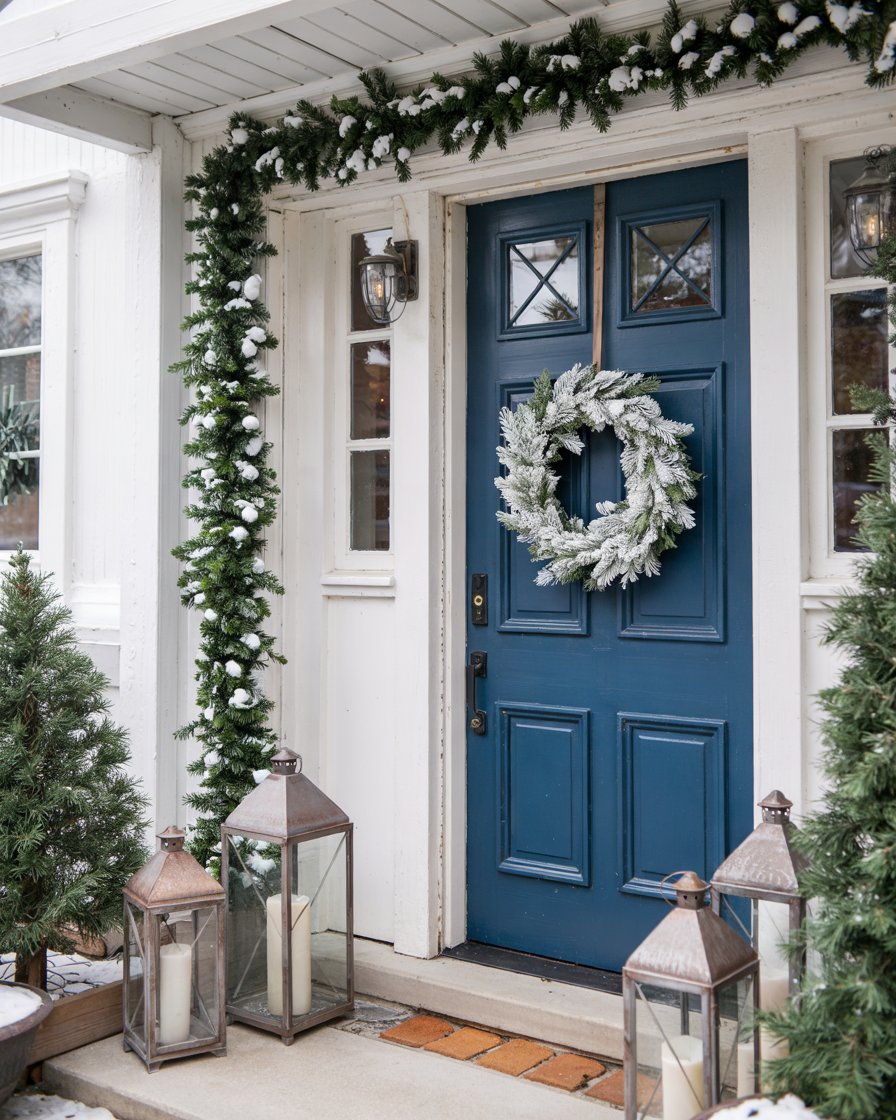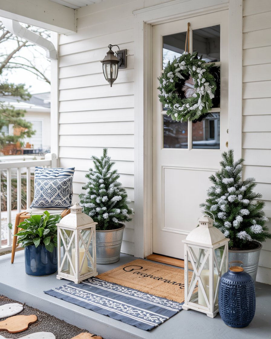 If you are after a late-winter porch decorating idea that feels seasonal without feeling Christmas-y at all, choose blue and white. It is perfect for January and conjures up a crisp snowy ambiance. Think navy blue door mats, icy garlands, and pale planters holding frosted branches. This clean, neutral approach is classic style that would marry the white lanterns and some woven textures to suggest a cozy yet sophisticated entryway. Designers from Better Homes & Gardens often speak about how blue tones brighten up short winter days.