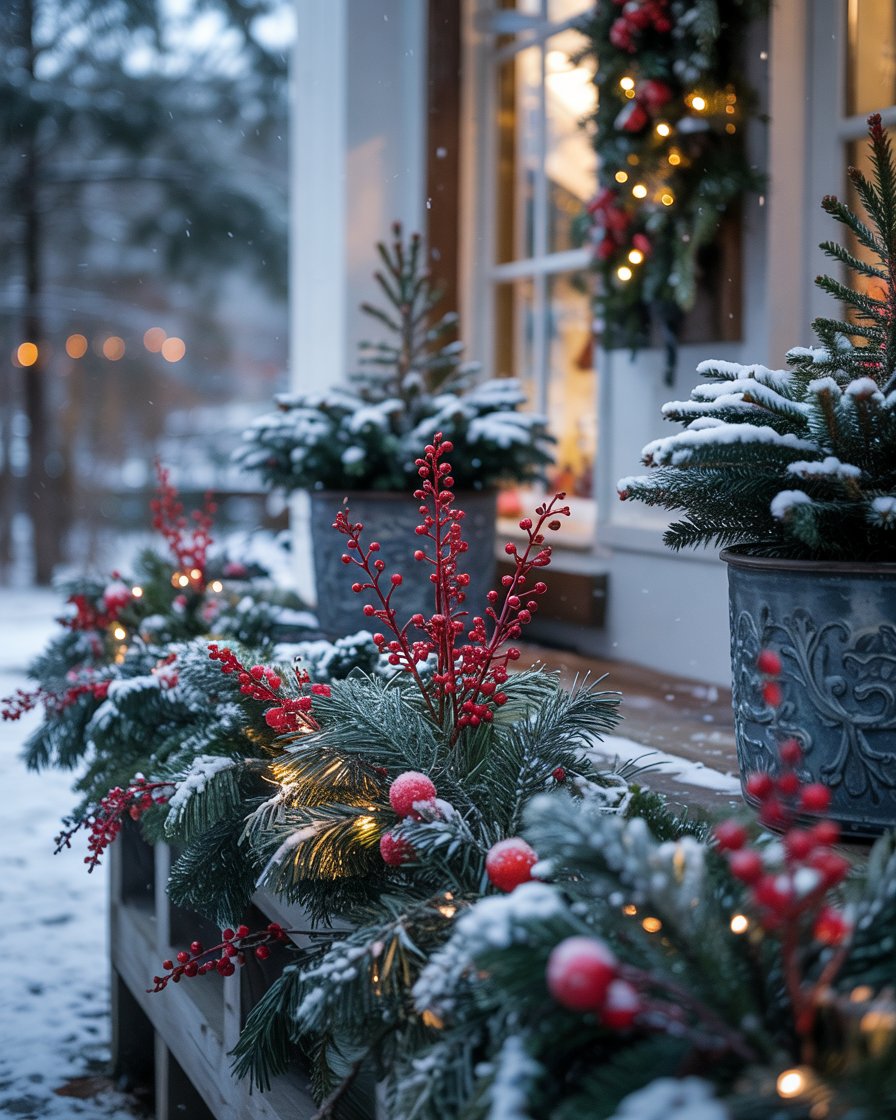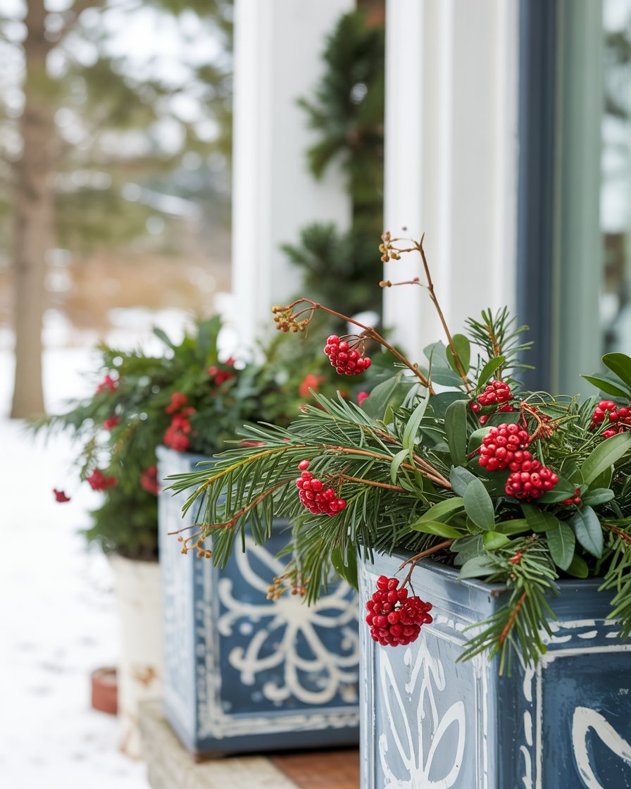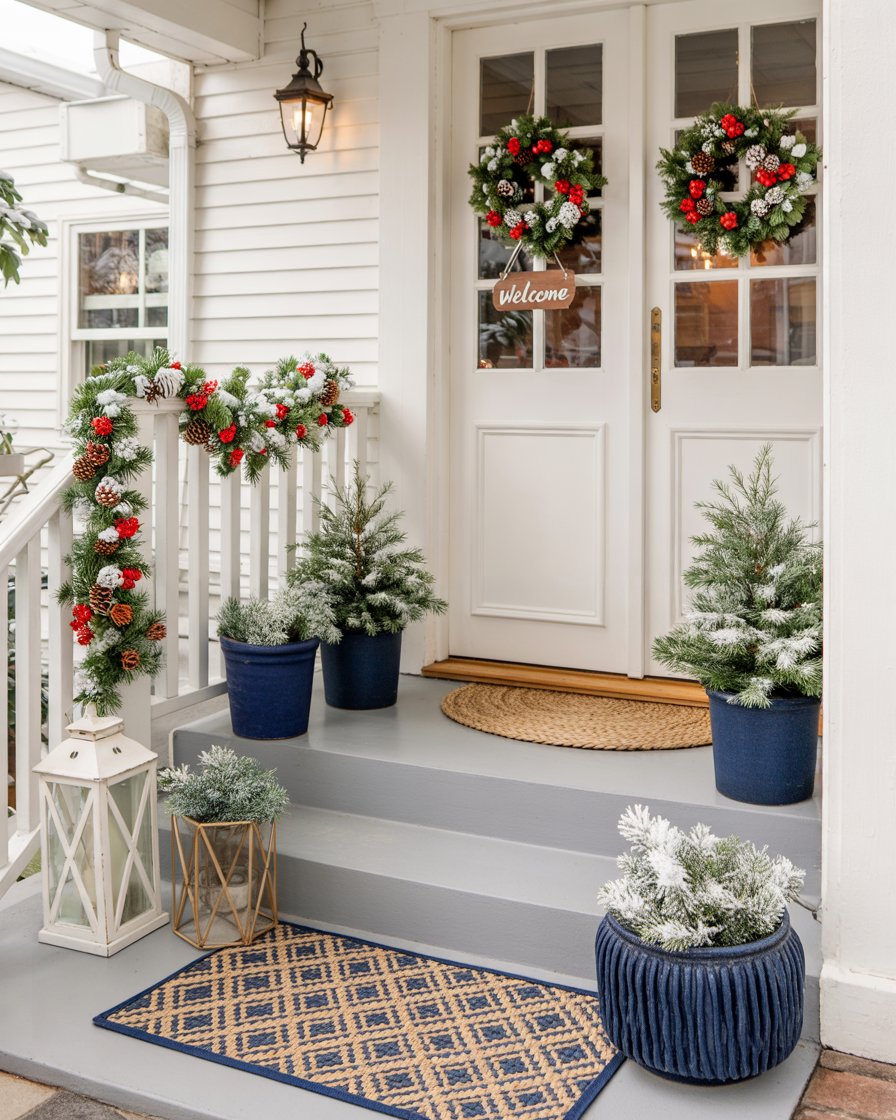 To make blue and white palettes pop, introduce bright red berry sprays into winter porch decorations. Whether tucked into garlands, Christmas pots planters, or wreaths, the contrast adds vibrancy without feeling overly Christmas. This is a designer trick from Gardenista, giving porches a cheerful twist after Christmas, especially against snowy backdrops or neutral siding.
