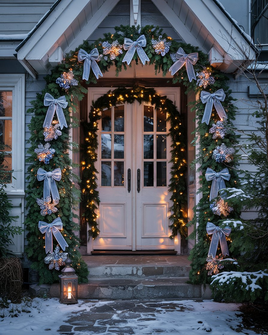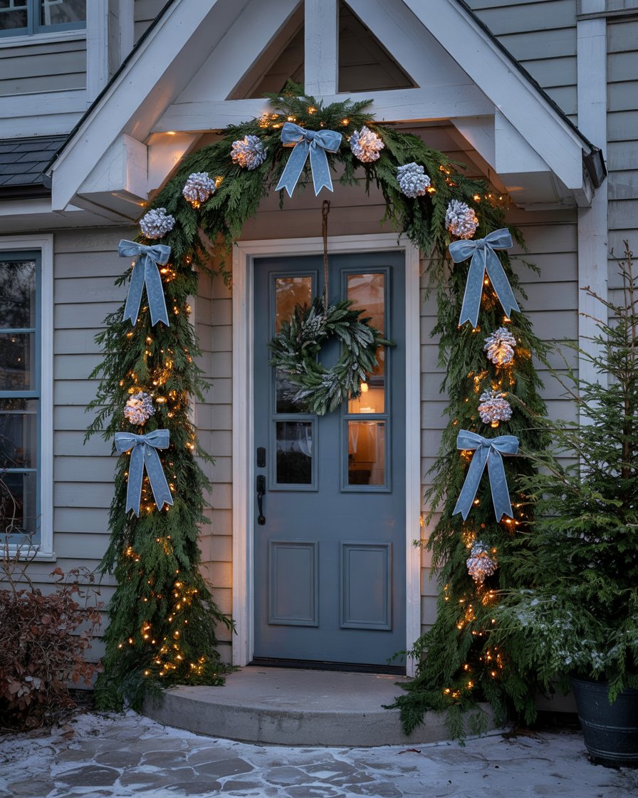 An evergreen archway framing your entry instantly elevates winter porch decorations, especially after Christmas. Instead of red ribbons, use white twinkle lights and blue velvet bows for a crisp snowy look. Add icy faux berries for texture. This outdoor feature works for both Christmas front doors and January, giving a grand but budget-friendly entrance. Better Homes & Gardens stylists often highlight archways for creating memorable winter curb appeal.