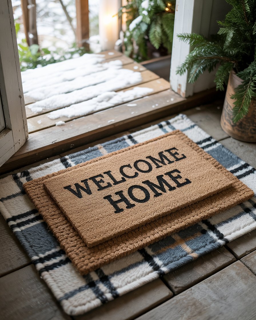 Stacking mats is a simple way to bring personality to winter porch decorating ideas farmhouse. Start with a plaid blue and white rug, then layer a natural coir doormat with a Rustic or witty winter saying. This small diy upgrade works beautifully after Christmas, adding warmth without needing full garlands. Apartment Therapy often recommends layered mats to give entryways depth and charm.