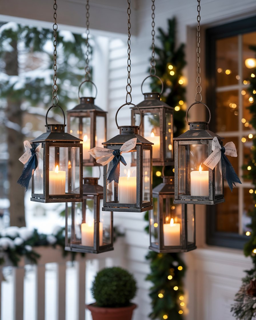 If your porch feels flat after Christmas, think vertical. Hanging baskets repurposed as lanterns filled with LED candles or string lights create enchanting winter porch decorations. Pair with white ribbon or blue fabric for seasonal flair. This idea adds soft light without crowding the floor—perfect for smaller outdoor spaces. Real Simple highlights vertical lighting as a clever winter trick.