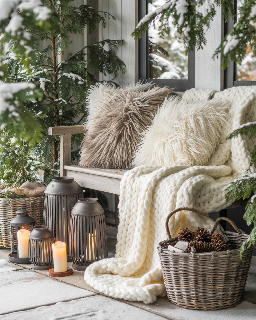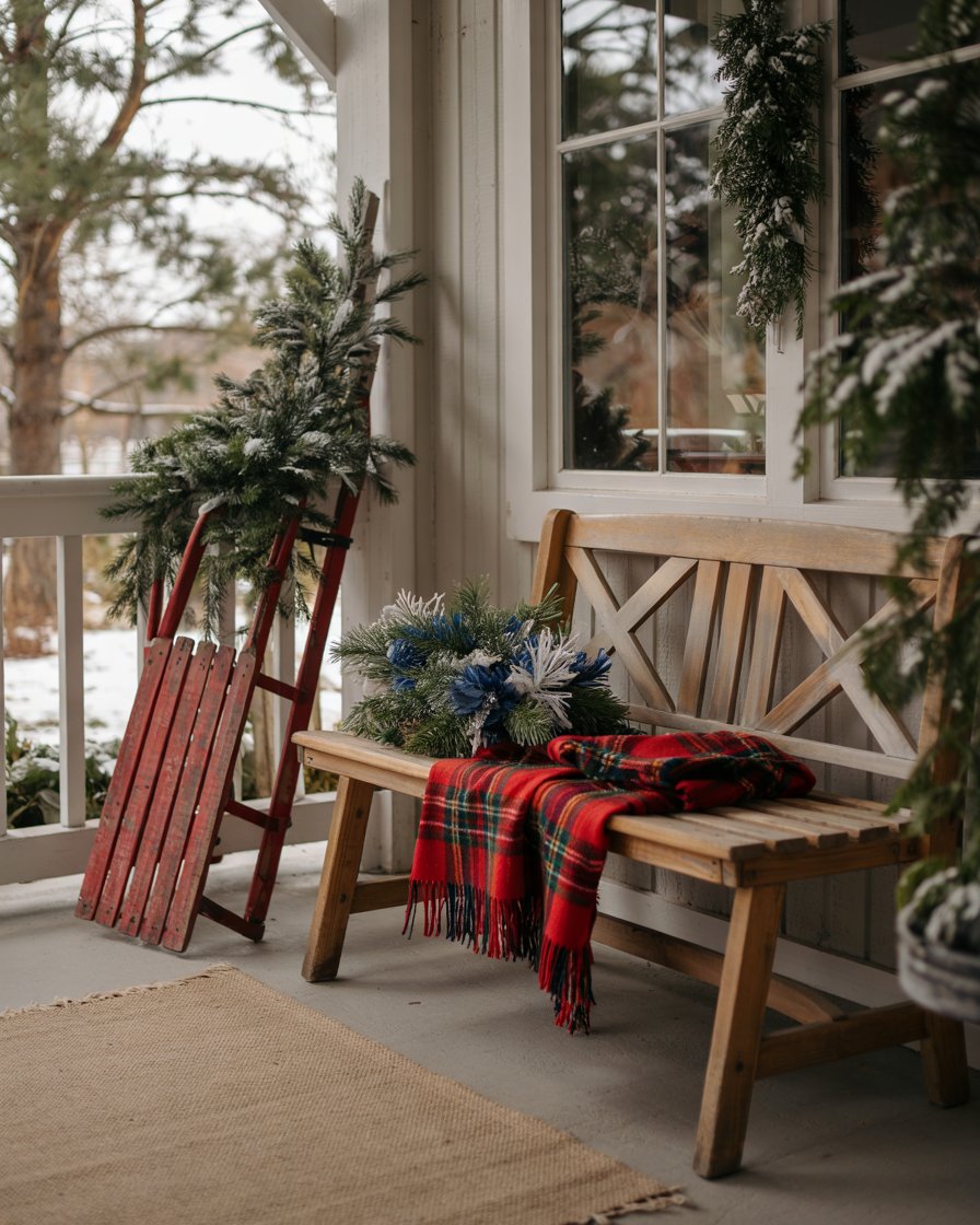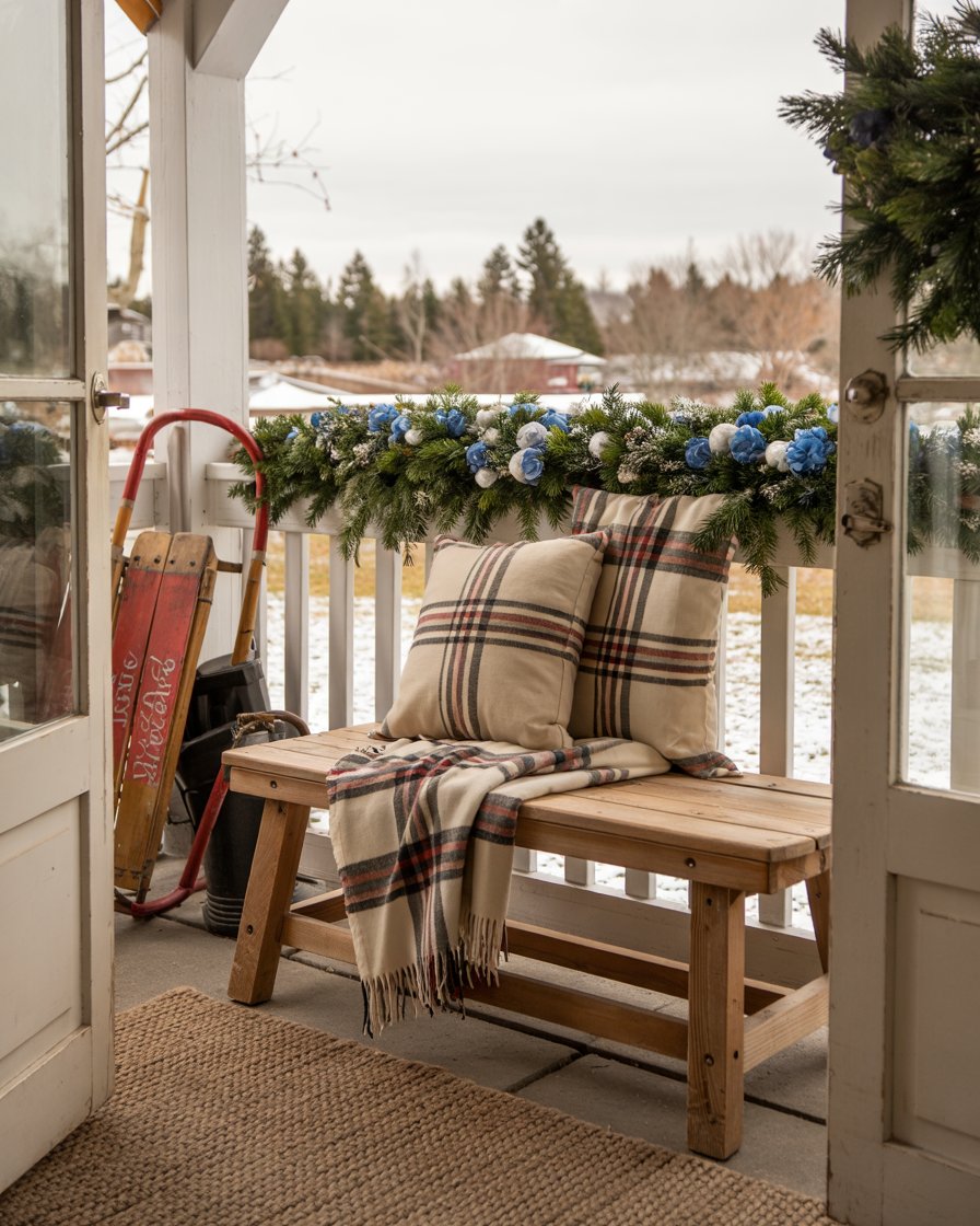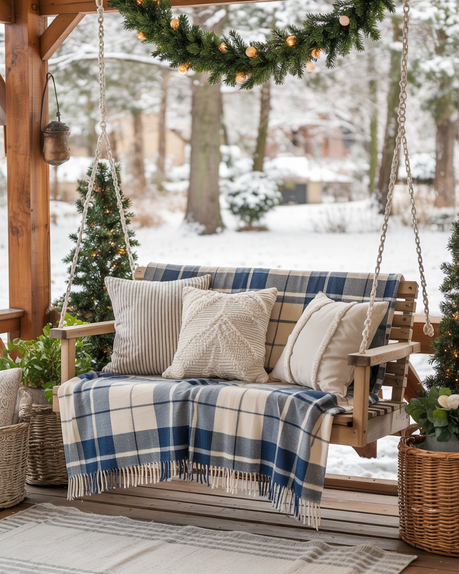 Transform a porch swing into a cozy January retreat. Add blue and white plaid throws, chunky knit pillows, and festive garland ideas draped along the top. It’s an inviting way to keep the porch lively after Christmas, blending Rustic charm with soft textures. This works especially well for farmhouse-style porches where layering textiles makes the cold feel intentional, not dreary.