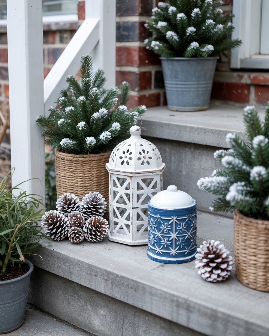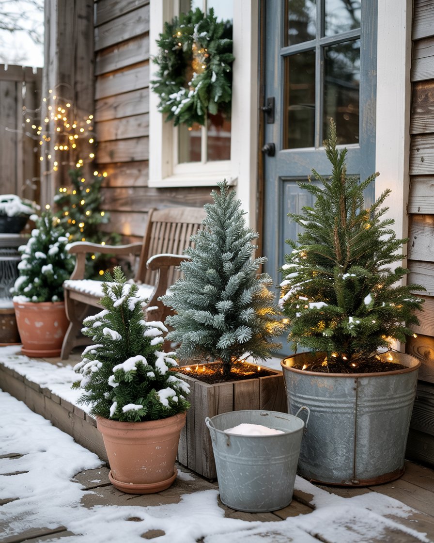 Instead of one or two Christmas pots planters, group several smaller potted evergreens for a whimsical outdoor scene. Arrange them at varying heights, sprinkle faux snow on top, and add blue lights for a magical winter porch decorating ideas display. This diy approach feels festive yet works deep into January, giving your entrance a woodland charm. Gardenista calls this the “mini forest” trend.