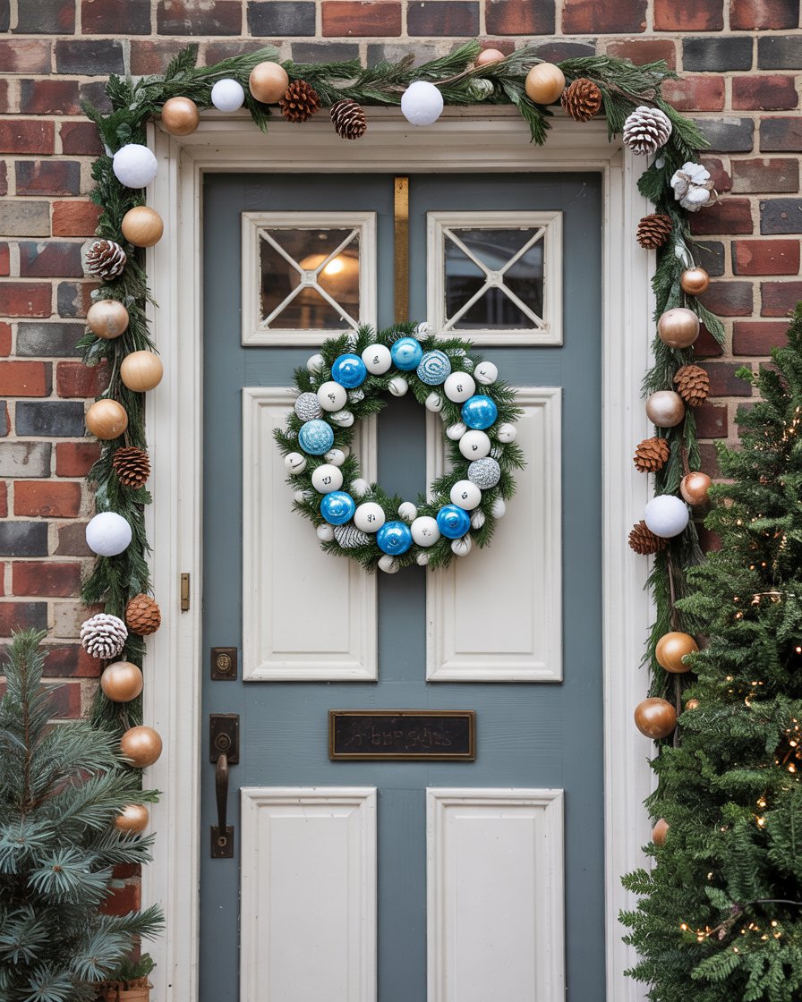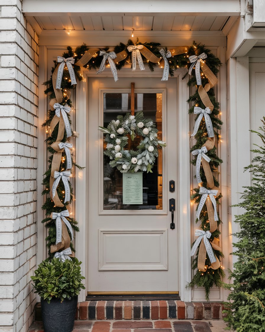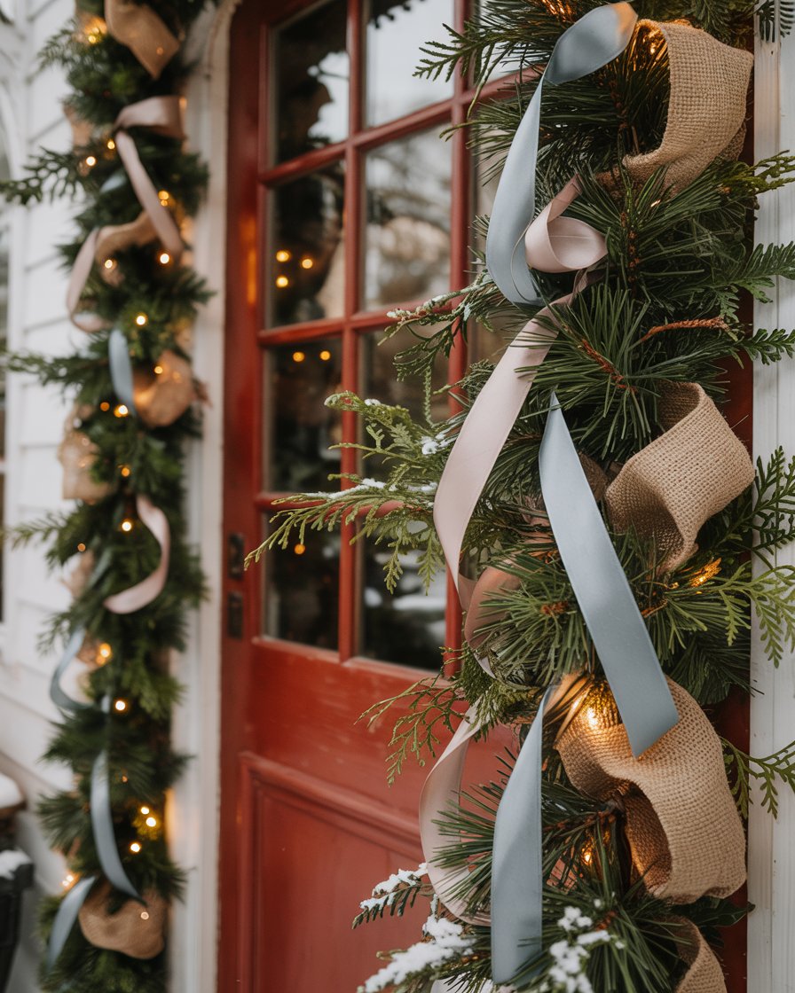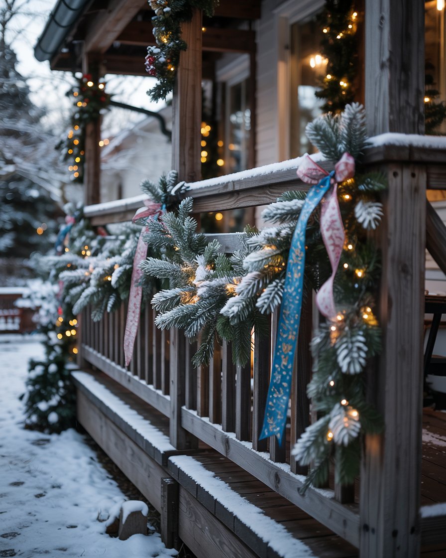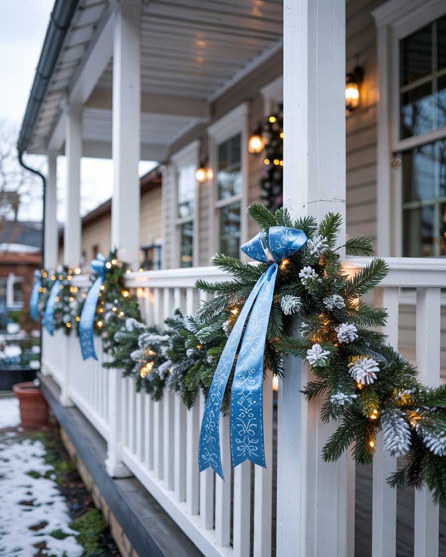 Instead of framing the door, swag your festive garland ideas across porch railings for a different effect. Choose white twinkle lights, frosted evergreen branches, and blue ribbon tails cascading for drama. This winter porch decorating idea works beautifully for wraparound porches and adds curb appeal after Christmas without feeling too “holiday.” HGTV recommends railing swags for visual depth.