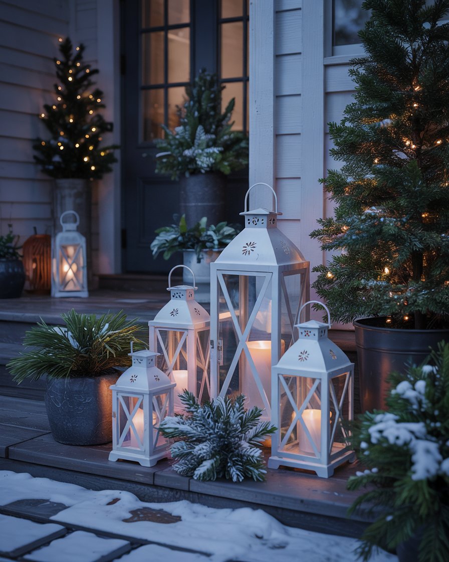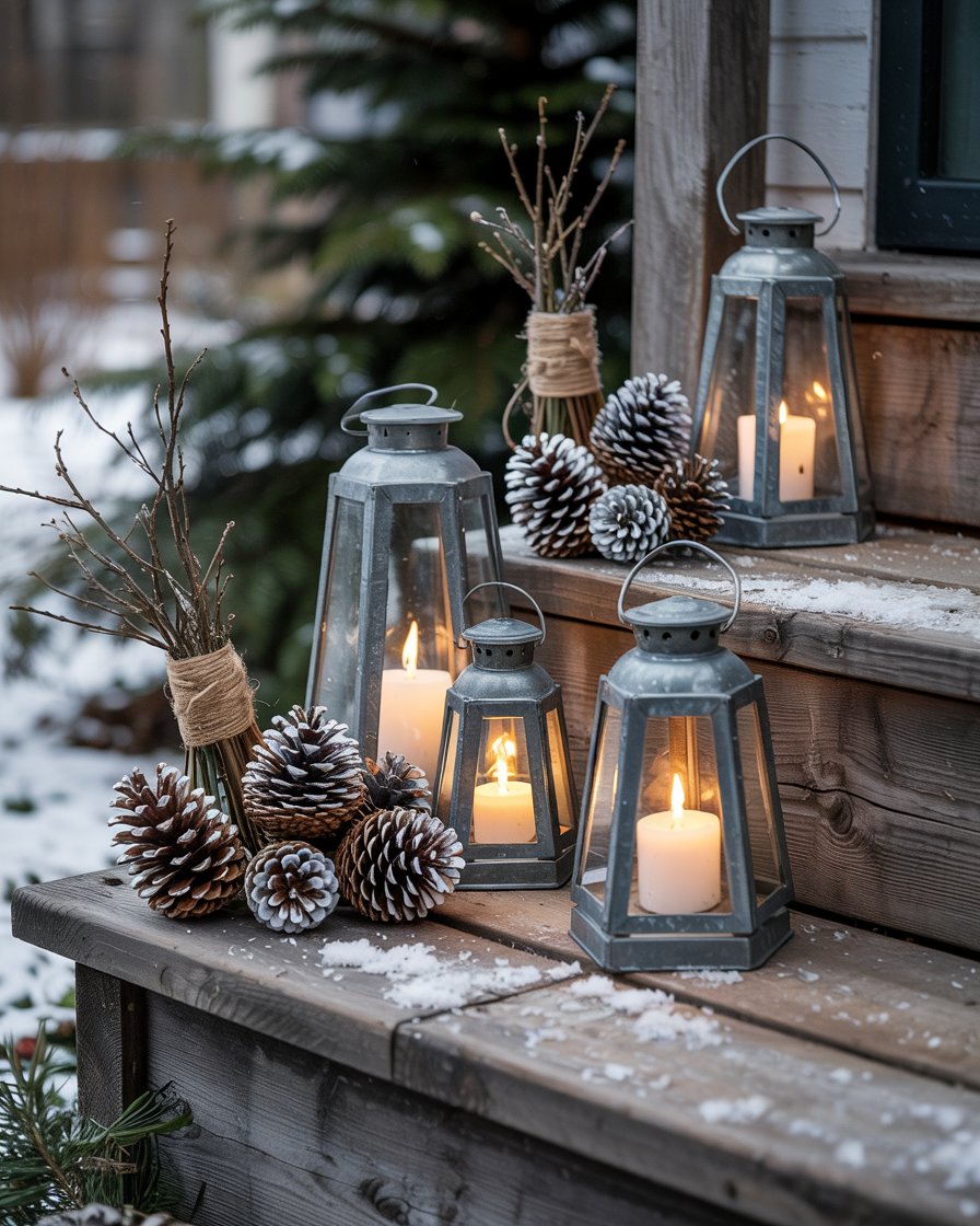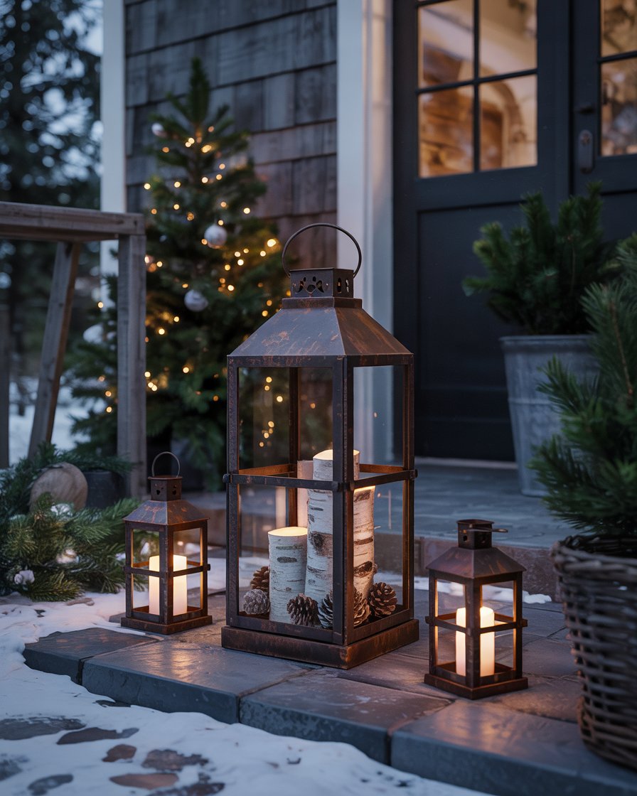 For porches with wide steps or landing spaces, one striking oversized Rustic lantern filled with birch logs, pinecones, and faux snow can be a showstopper. Surround it with smaller lanterns for layered glow. This simple, budget idea suits winter porch decorations in neutral tones, giving your entry a warm, structured centerpiece. Country Living often uses lantern groupings for seasonal drama.