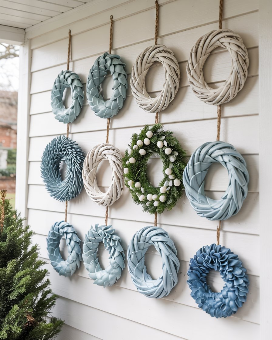 Why stop at one wreath? Create a winter porch decorating ideas statement wall with multiple wreaths in different blue and white patterns, hung in a neat grid or staggered layout. Mix materials like grapevine, eucalyptus, and frosted pine. It’s a diy, Rustic-meets-modern twist that turns any blank wall into a seasonal art installation after Christmas. House Beautiful calls this a chic alternative to standard decor.
