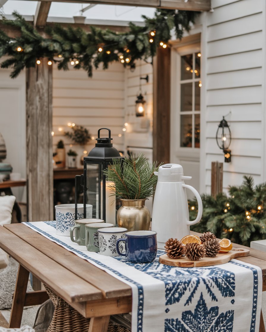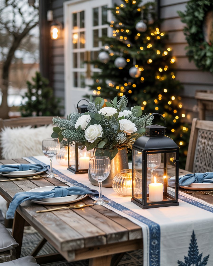 A Rustic or vintage table on your porch can be styled like a mini winter party zone. Layer blue and white runners, add glowing lanterns, frosted eucalyptus, and neutral dishware. This diy idea works beautifully for outdoor entertaining after Christmas, bringing lively color and texture to otherwise dormant spaces. The Spruce highlights porch tablescapes as a top January trend for cozy winter gatherings.