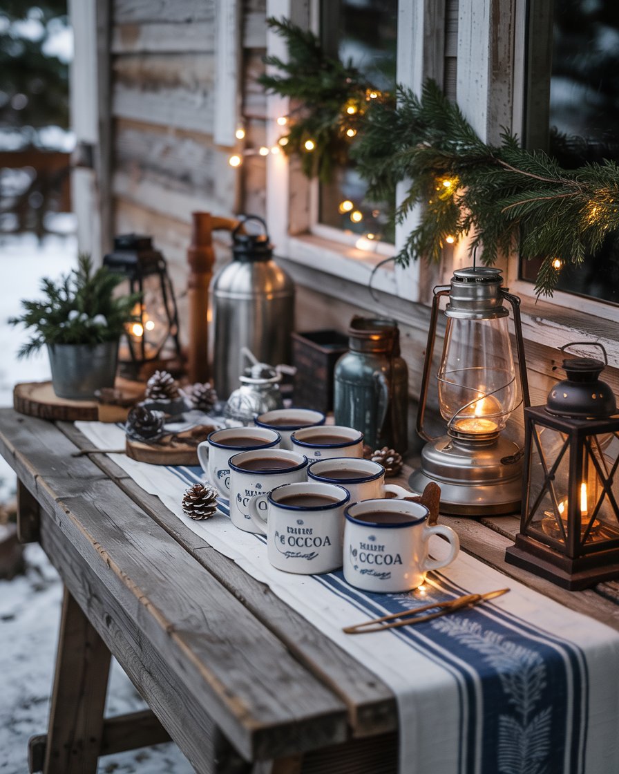 Inject some brightness with a cozy hot cocoa bar setup on a small Rustic table. Add lanterns, enamel mugs, a thermos, and baskets with marshmallows. Decorate with blue and white runners, pinecones, and festive garland ideas overhead. It’s a playful after Christmas touch that makes porches feel alive even in the cold. The Spruce notes that interactive decor is trending for winter gatherings.