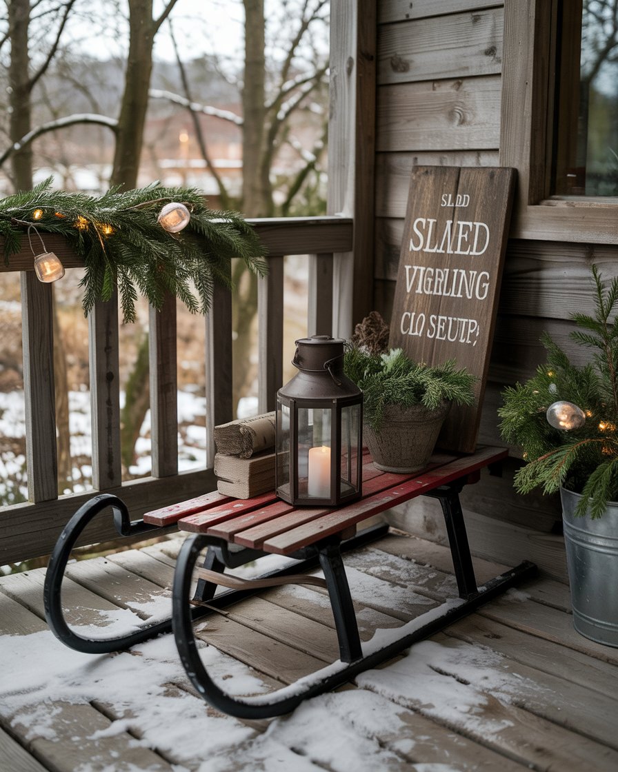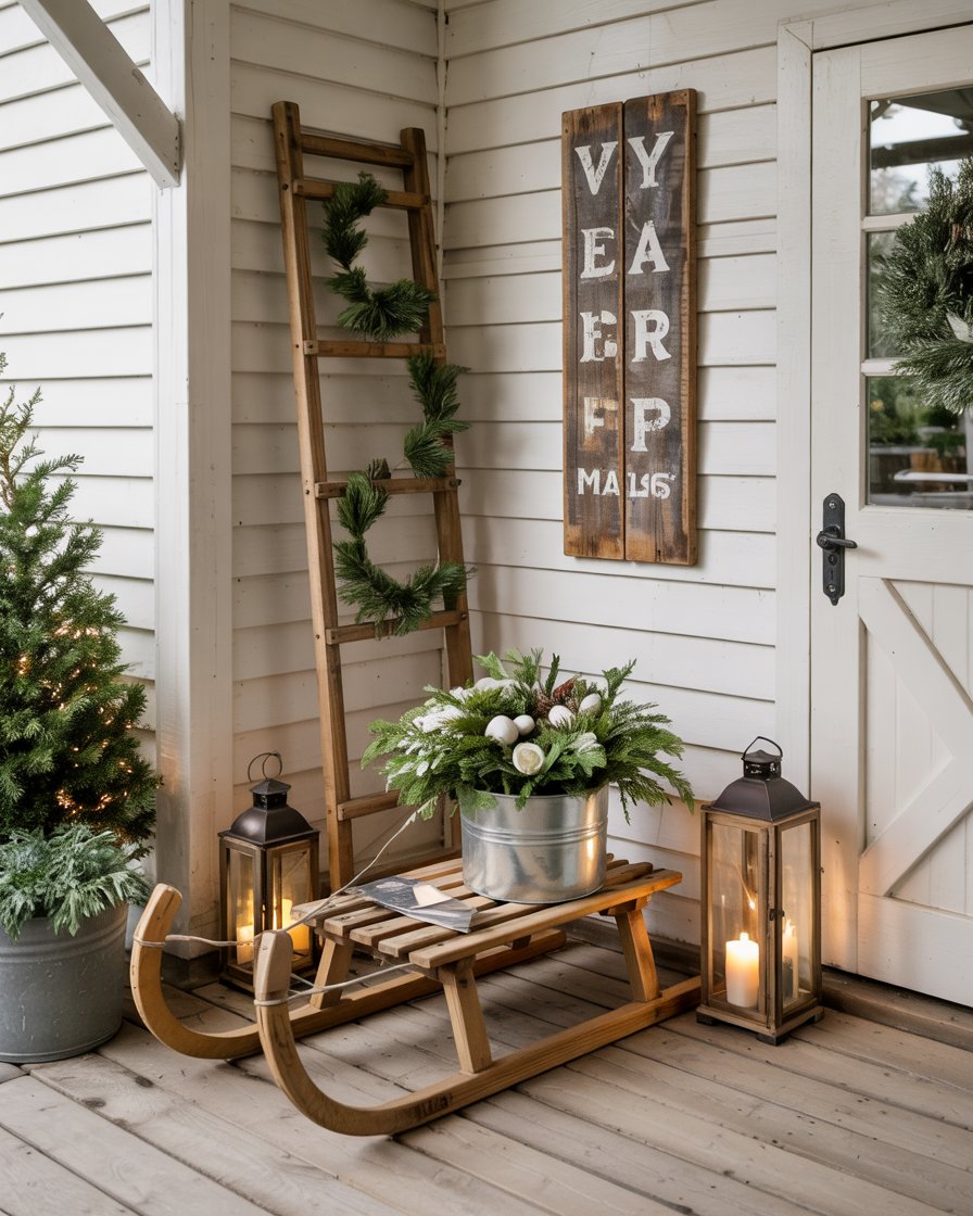 Leaning onto the Rustic charm warms up winter porch decorations. A vintage sled leaning against a wall coupled with primitive wood signs creates a nostalgic feeling out there. Add festive garland ideas made from evergreen sprigs, simple lanterns, and Christmas pots as planters with repurposed winter greens. It is very cheap compared to just keeping late holiday vibes without being overly Christmas. Country Living reports that sleds are so trending again for farmhouse-style porches.