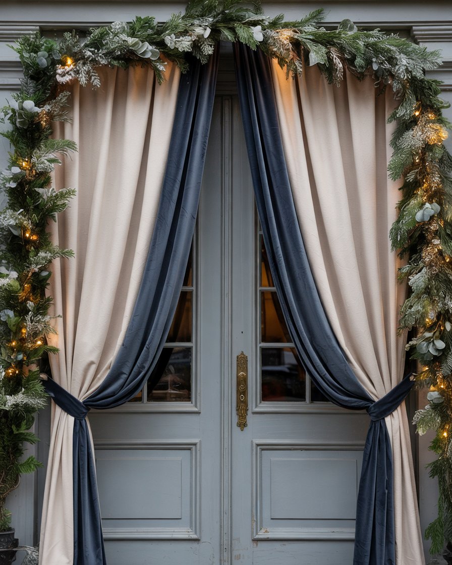 For a bold statement, drape thick winter fabrics like navy velvet or cream wool around Christmas front doors, tied back with white ribbons or blue sashes. Add frosted greenery for softness. This winter porch decorating idea is elegant, theatrical, and refreshingly not Christmas. It’s a designer trick often seen in Martha Stewart Living, perfect for homeowners who love high-impact visuals.