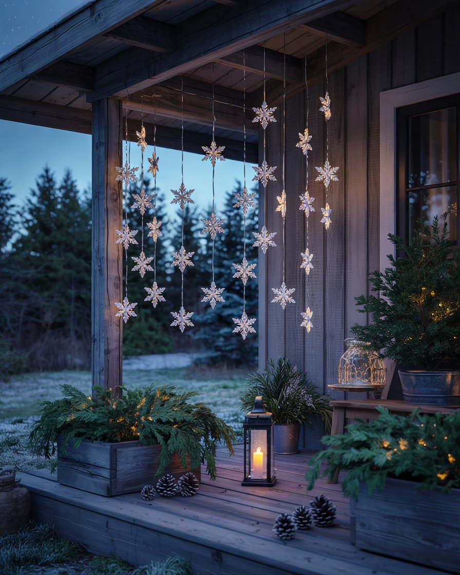 For porches lacking greenery, snowflake curtain lights create an instant festive winter backdrop. Hanging them across porch openings gives a magical blue and white glow, perfect for late holiday evenings. Pair with Rustic wood accents and a few Christmas pots planters repurposed with winter greenery for balance. HGTV designers love light curtains for making small spaces feel enchanted.