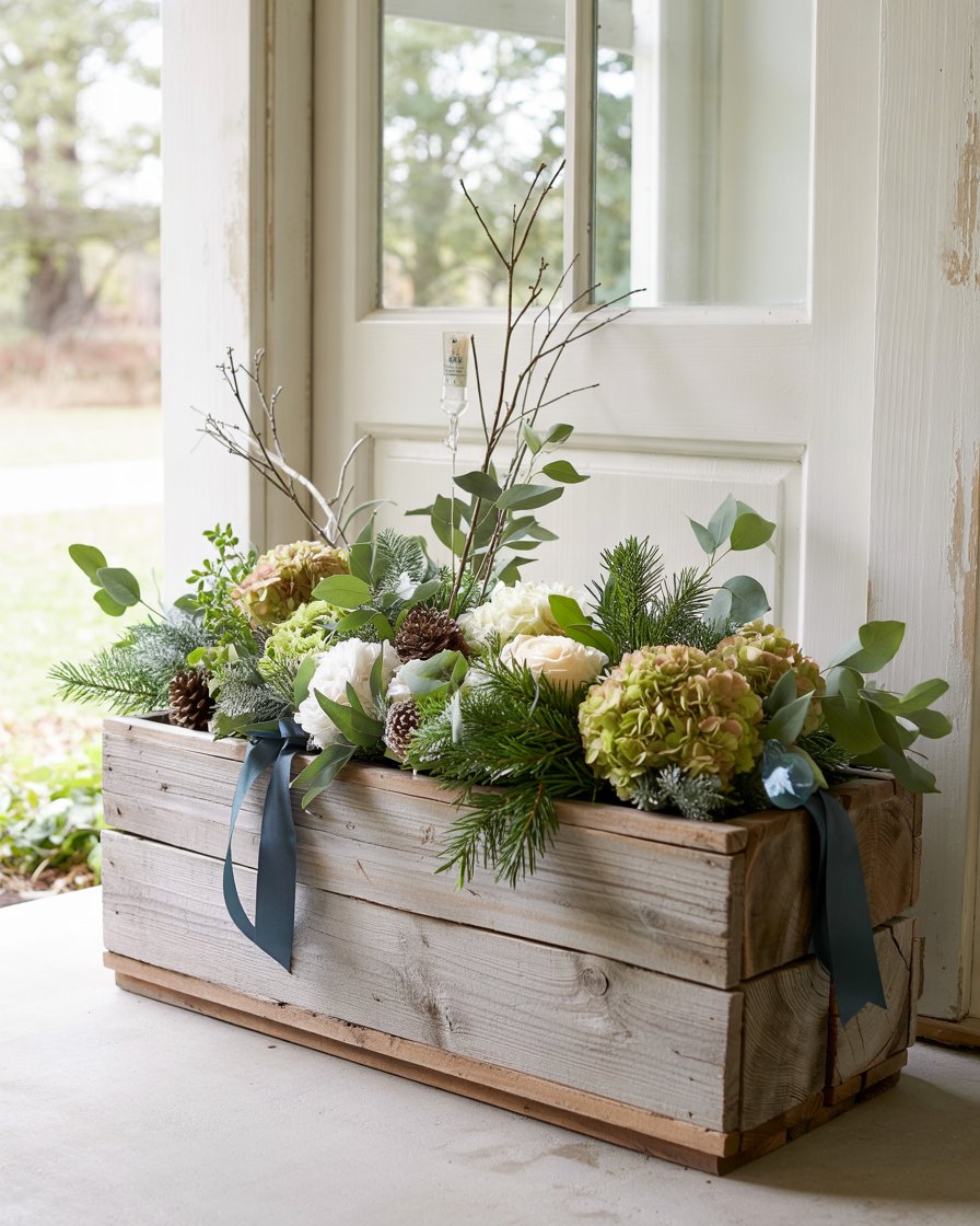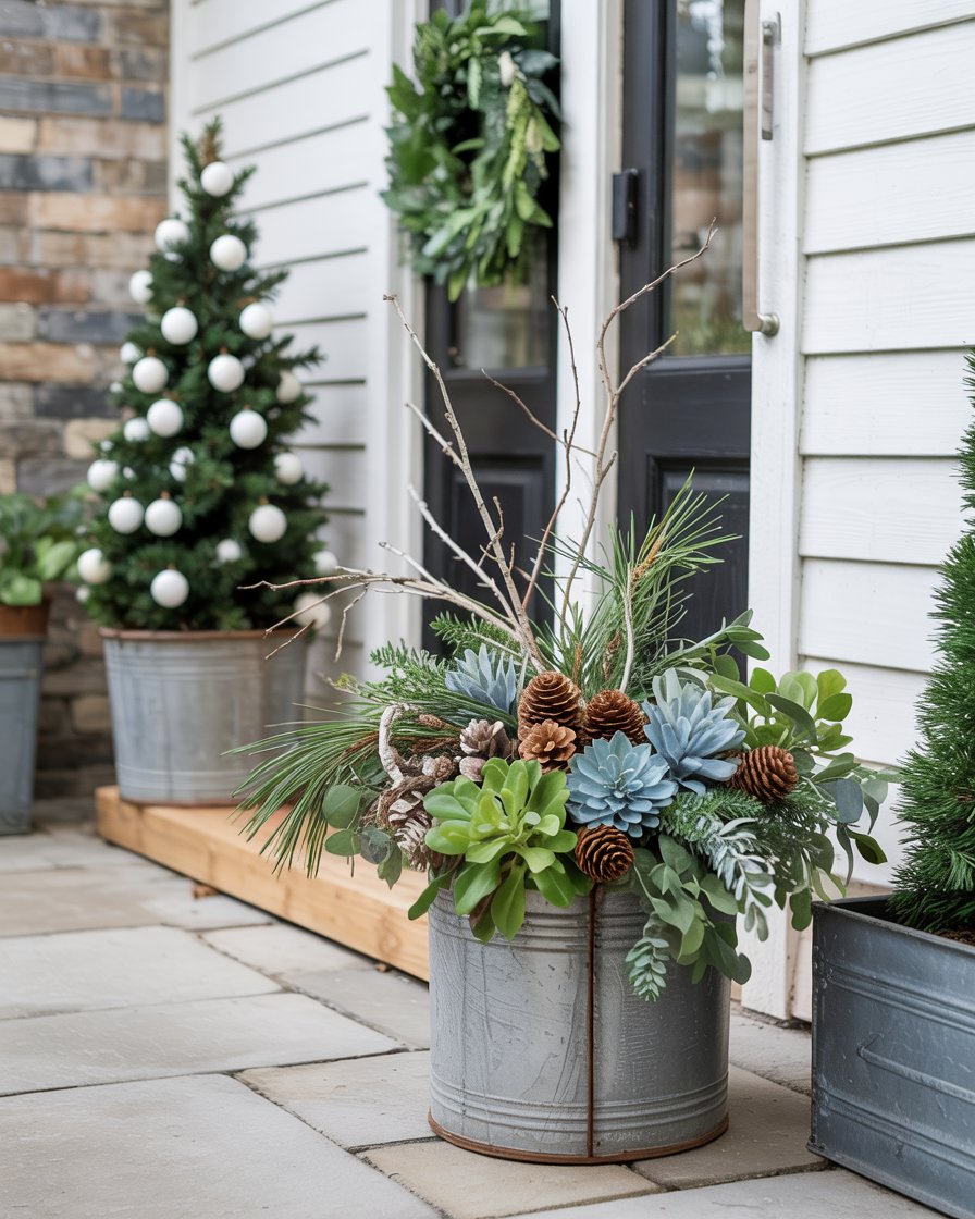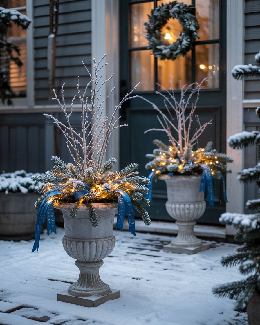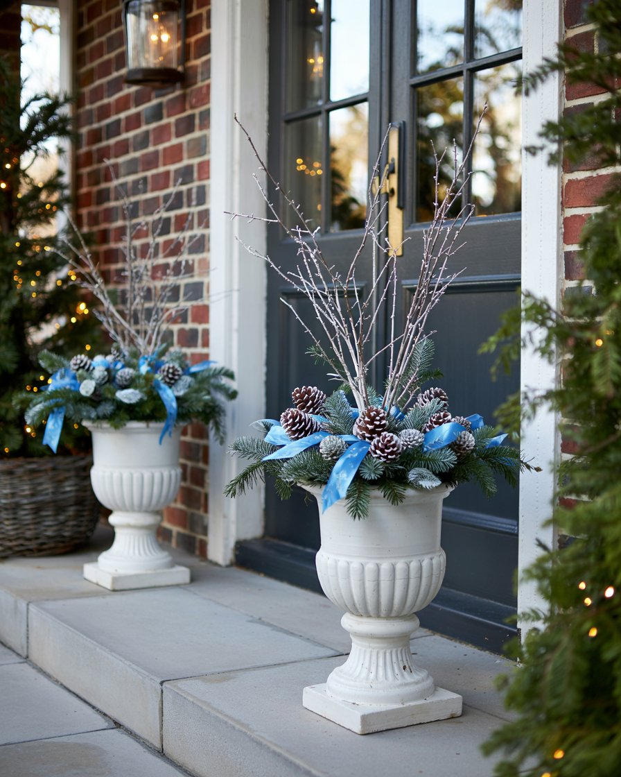 Don’t pack away your Christmas pots planters just yet. Remove the red bows and ornaments, and fill them with white, blue, or neutral winter greens like cedar and eucalyptus. Tuck in twigs or birch branches for height, and maybe a few pinecones for texture. This diy approach gives your porch fresh winter porch decorations without spending more. Gardenista often highlights this trick as a sustainable after Christmas solution.