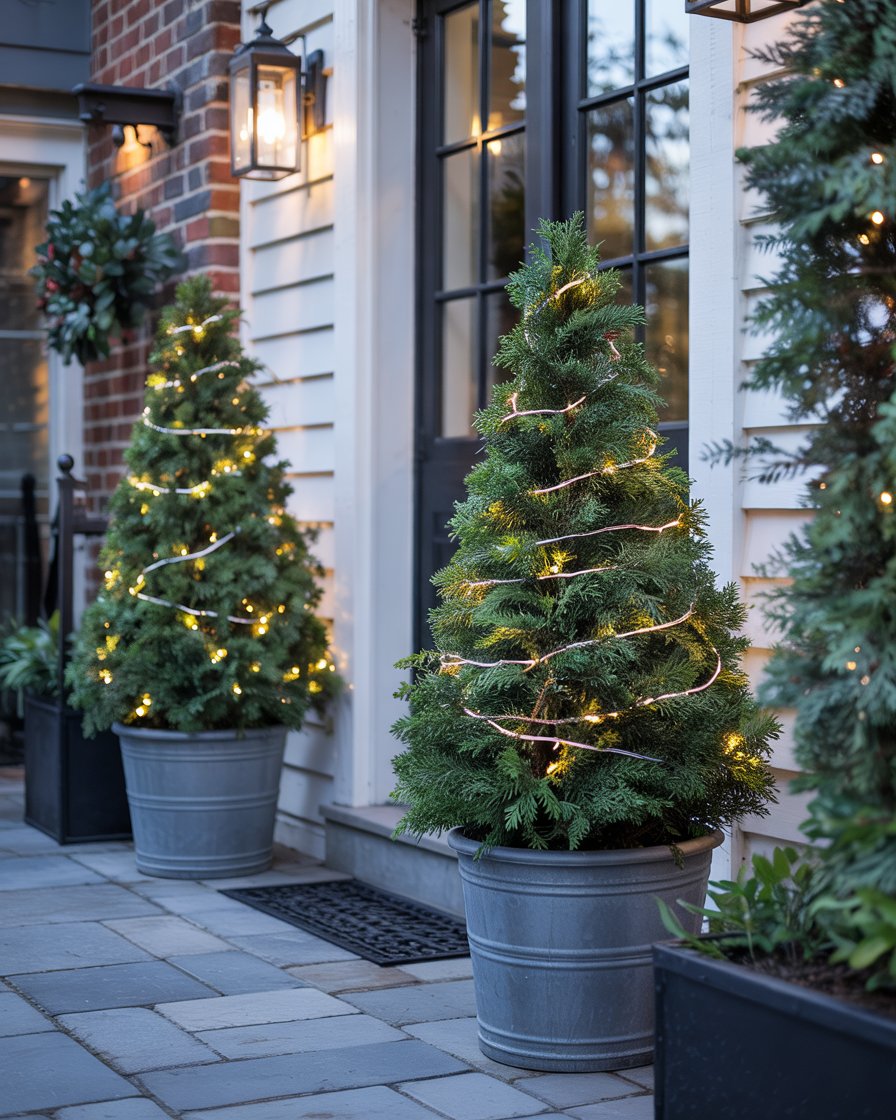 Create a polished, festive entryway with winter topiaries. Use cone-shaped evergreen trees in matching planters, wrapped in white or blue string lights. They’re simple, elegant, and work well after Christmas without needing overt ornaments. According to Better Homes & Gardens, matching topiaries instantly give porches a stately, welcoming air while staying budget-friendly.