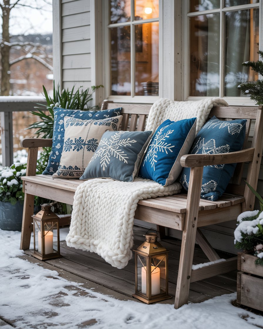 A porch bench can become a statement piece with bright blue and white winter pillows, a Rustic throw, and a few snowflake-patterned cushions. Add lanterns beneath for glow. This layered look transforms even small porches into cozy January havens. Apartment Therapy recommends swapping out traditional red plaid for bolder hues to make spaces feel fresh after Christmas.