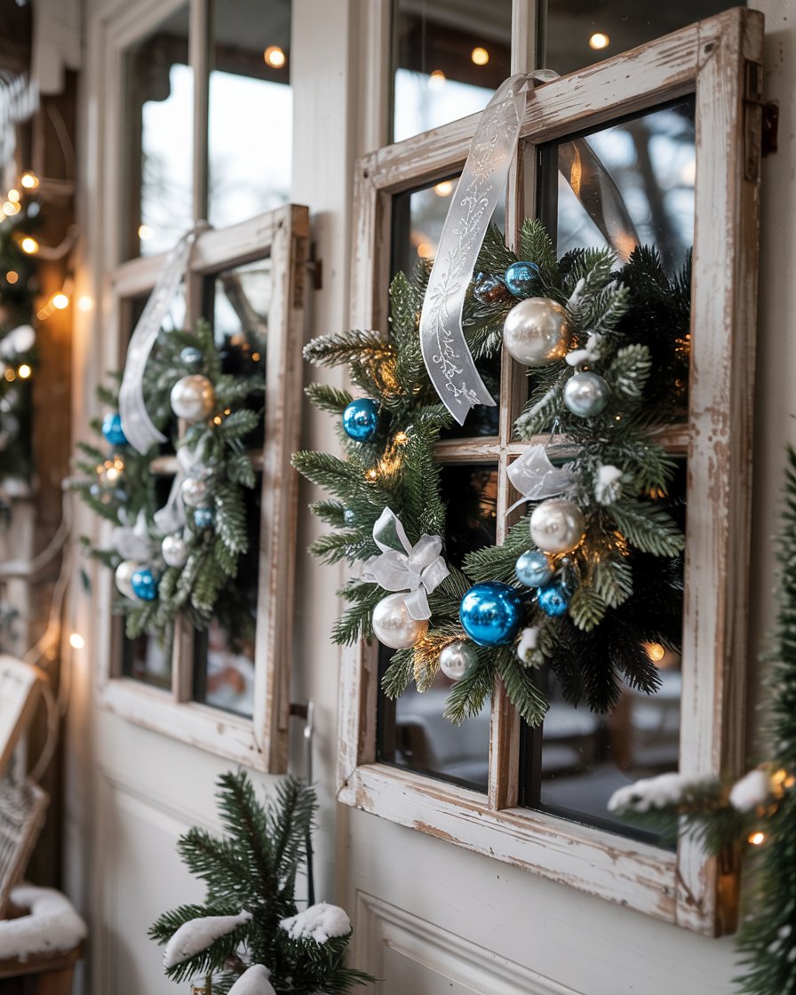 Hang vintage window frames on the wall and decorate them with snowy wreaths, white ribbons, and blue baubles. It’s a diy, primitive-meets-modern accent that gives porches instant personality after Christmas. These frames act like wall art, perfect for covered porches where they can be protected from the elements. Martha Stewart Living calls window frames a clever decor base for every season.