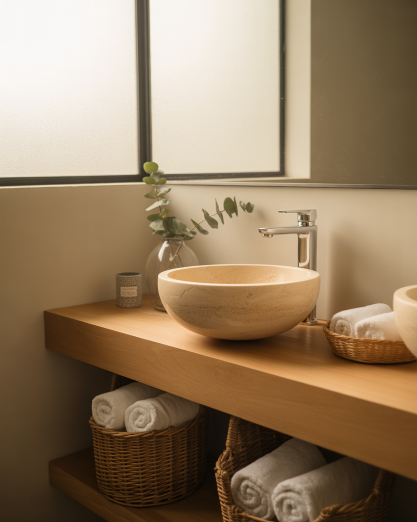 Where it works best: Small urban apartments and condos where the bathroom doubles as a daily-use powder room. The natural materials age gracefully and don’t show water spots as easily as high-gloss finishes, making maintenance surprisingly simple. Consider adding a rainfall showerhead and a small wooden stool to complete the spa experience without overwhelming the space.
