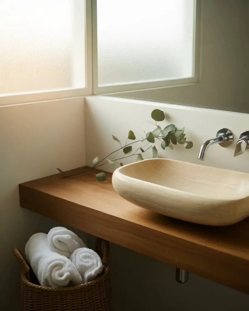 Transform your guest bathroom into a spa-like retreat by layering natural materials like teak, stone, and linen. This approach works beautifully in apartment settings where square footage is limited but the desire for calm is universal. Pair a floating vanity in warm wood with a vessel sink in cream travertine, then add rolled towels in a woven basket and a small potted eucalyptus branch. The neutral palette creates an instant sense of relaxation, while the textures add depth without visual clutter.