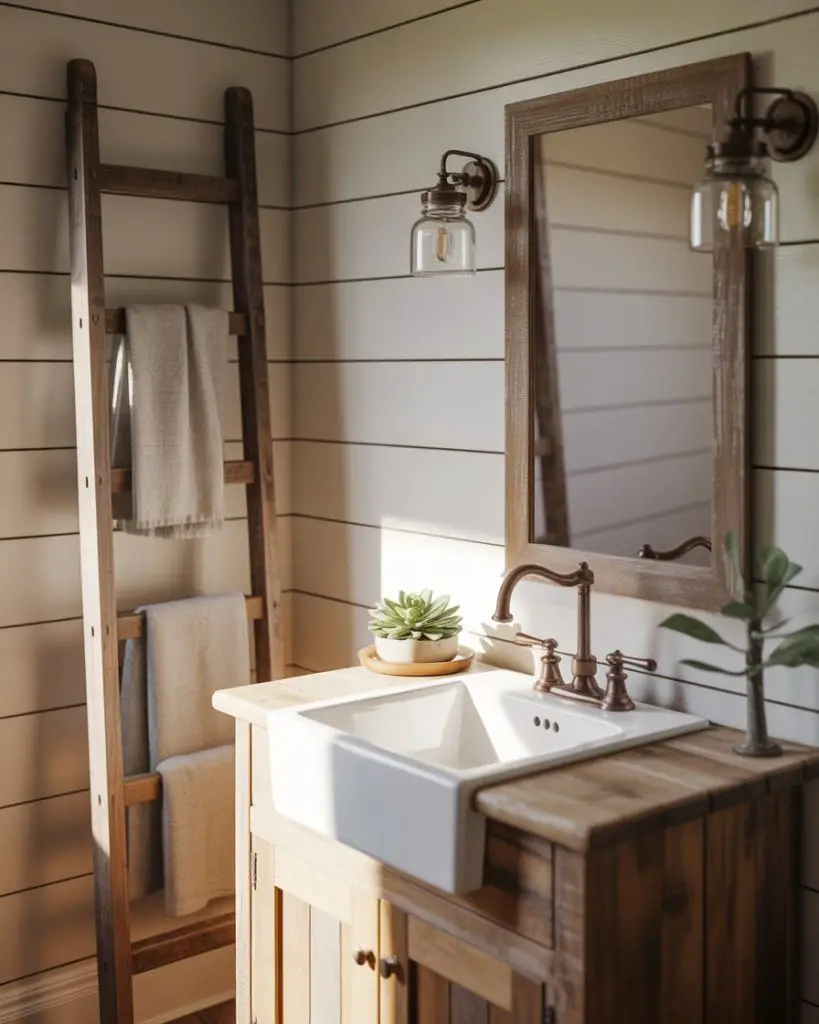 A rustic guest bathroom embraces imperfection in the most charming way—think reclaimed barn wood vanities, vintage-style fixtures, and open shelving made from weathered planks. Pair these organic textures with simple white subway tile or shiplap walls to keep the space from feeling too heavy. Add a galvanized metal mirror frame, mason jar sconces, or an old ladder repurposed as a towel rack. The result feels collected over time rather than decorated in a day.