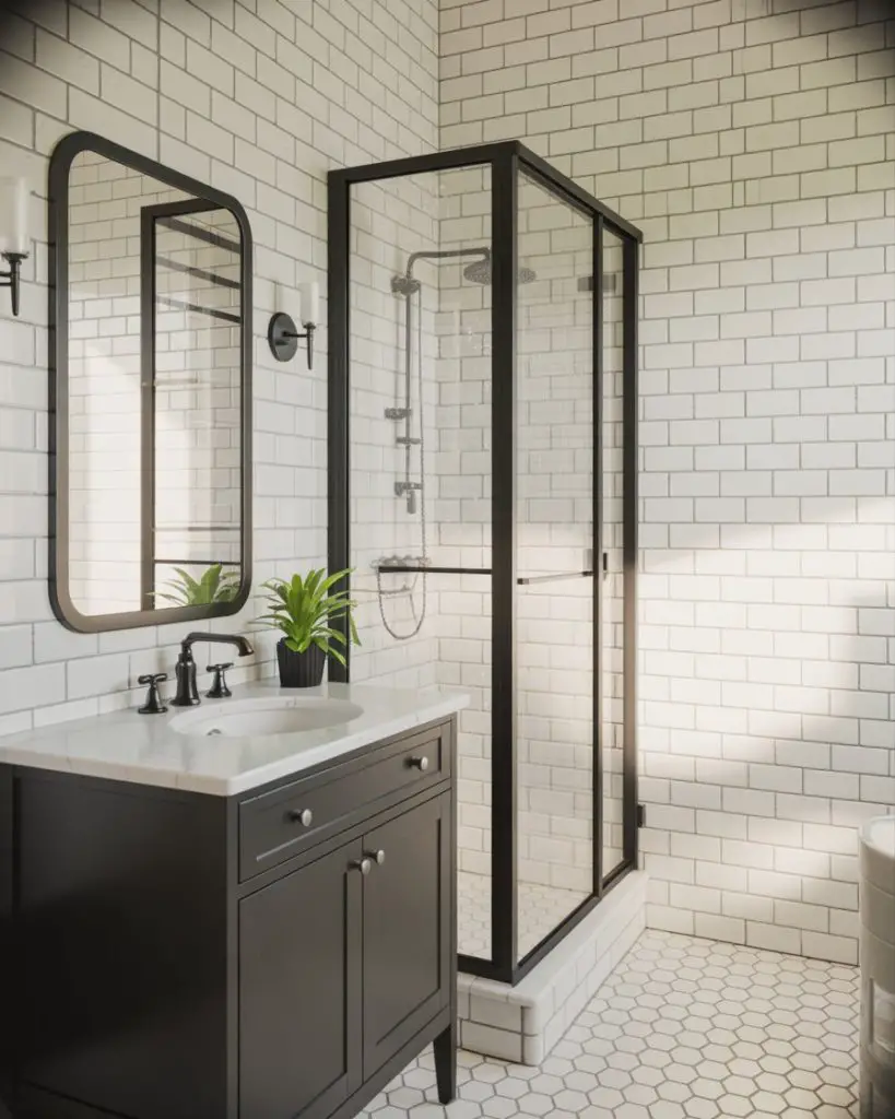 Real homeowner behavior: Many people overthink small bathrooms and end up with too many competing ideas. A homeowner in Brooklyn kept her 15-square-foot powder room dead simple—black hex floor tile, white walls, one statement light fixture—and it became the most photographed room in her apartment. Sometimes restraint is the real luxury, especially when space is at a premium.
