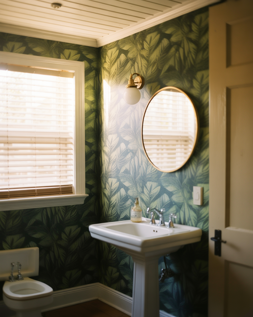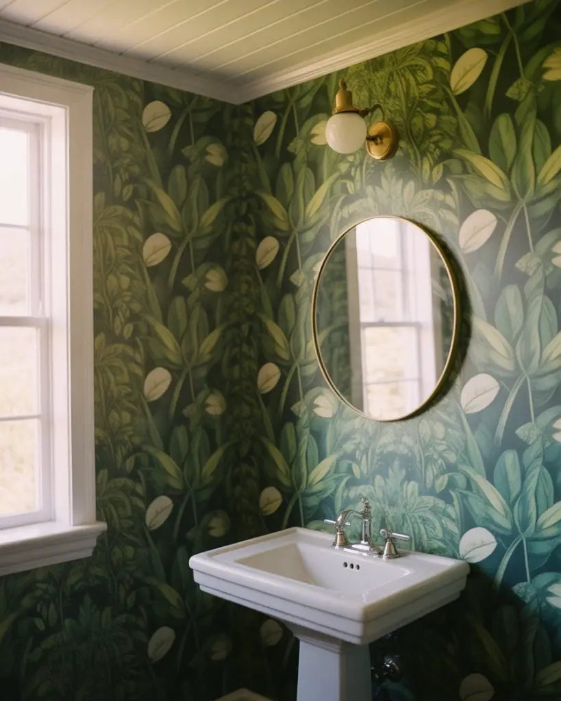 Guest bathrooms offer the perfect opportunity to experiment with bold wallpaper since the commitment is limited to a small space. Choose fun patterns—tropical leaves, chinoiserie, geometric prints, or vintage-inspired florals—that make a statement the moment someone opens the door. Balance the busy walls with simple fixtures in white or neutral tones, and keep accessories minimal. This approach works especially well in powder rooms where there’s no shower steam to worry about, though modern vinyl-coated papers handle moisture reasonably well in full baths too.