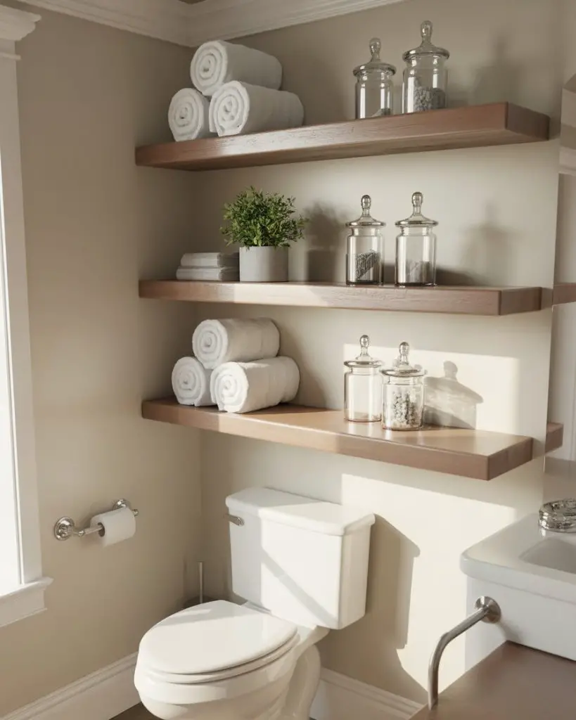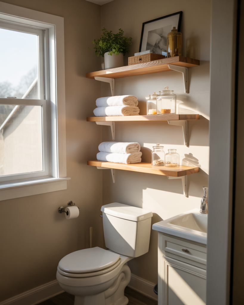 Real homeowner behavior: Most people initially worry that open shelving means everything is on display, but the reality is it encourages better organization. When your storage is visible, you’re more likely to keep it tidy and only stock what you actually use. Keep a lidded basket on the bottom shelf for less photogenic items like extra toilet paper or cleaning supplies—function and aesthetics coexist peacefully.
