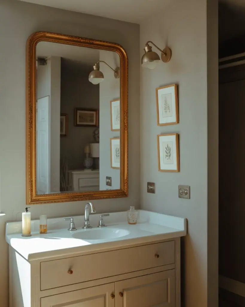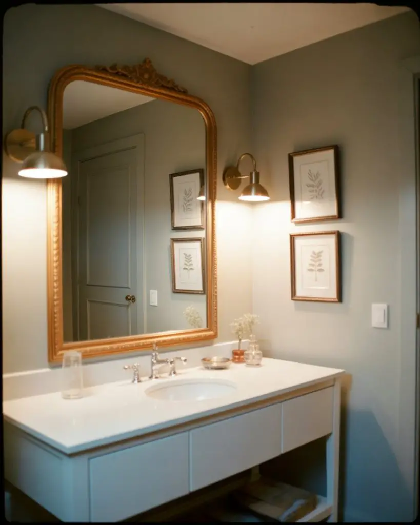 Treating your guest bathroom like a miniature art gallery elevates it from purely functional to genuinely interesting. Hang an oversized mirror with an ornate frame—think antique gold, carved wood, or even a contemporary geometric design—that becomes a focal point rather than just a reflective surface. Add one or two pieces of framed art on adjacent walls, ensure lighting is museum-quality with adjustable sconces, and keep everything else understated. This elegant modern approach works beautifully in neutral spaces where the art and mirror provide all the personality needed.