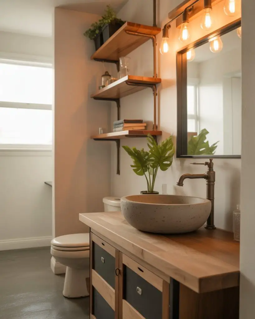 An industrial-inspired guest bathroom pairs raw concrete elements with metal accents for a look that feels urban and unexpectedly warm when done right. Consider a concrete vessel sink, open pipe shelving, or even polished concrete floors paired with wood accents to soften the hard edges. Edison bulb sconces, matte black fixtures, and perhaps one vintage mirror add character without cluttering the minimalist foundation. This aesthetic works particularly well in loft apartments or modern builds where the industrial bones are already present, though it can feel out of place in traditional homes.