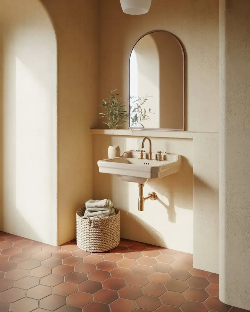 Bring timeless Mediterranean charm to your guest bathroom through warm terracotta floor tile, arched mirrors or doorways, and a palette of cream, terra cotta, and soft blue. This look embraces texture—think hand-plastered walls, rough-hewn wood, and woven baskets—while maintaining a sense of casual elegance. A simple pedestal sink or wall-mounted console keeps the focus on architectural details, and vintage-inspired brass fixtures add warmth without overwhelming the earthy foundation. The result feels like a Spanish villa bathroom transplanted to American soil.