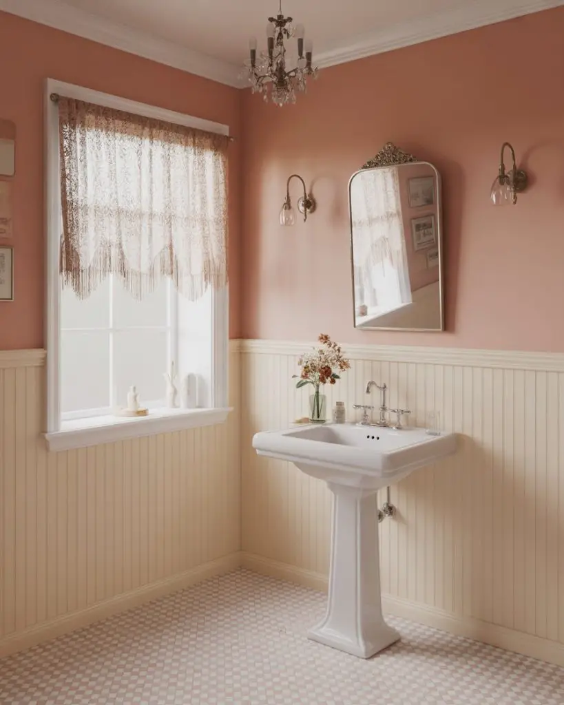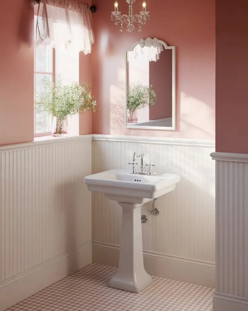 For those familiar with Bloxburg and similar design game aesthetics, recreating that cute pastel nostalgia in a real guest bathroom can be surprisingly satisfying. Think soft pink or mint walls, white beadboard wainscoting, vintage-style fixtures with cross handles, and perhaps a small chandelier or vintage sconces. A pedestal sink keeps the look light, while checkered floor tile in pastel tones adds playful pattern. This approach works best in homes that already embrace traditional or cottage styling, where the sweetness feels intentional rather than disconnected from the overall aesthetic.