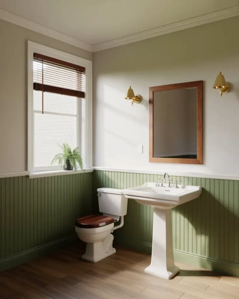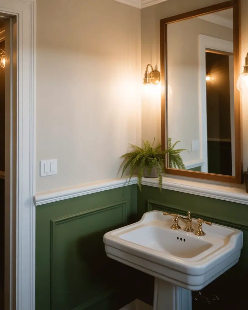 Common mistake to avoid: Green can read muddy or drab in bathrooms with poor lighting. If your guest bath lacks a window, install bright LED bulbs with a high CRI (color rendering index) of 90 or above—this ensures the green looks rich and intentional rather than dingy. Also test paint samples at different times of day, since artificial light can shift undertones significantly.