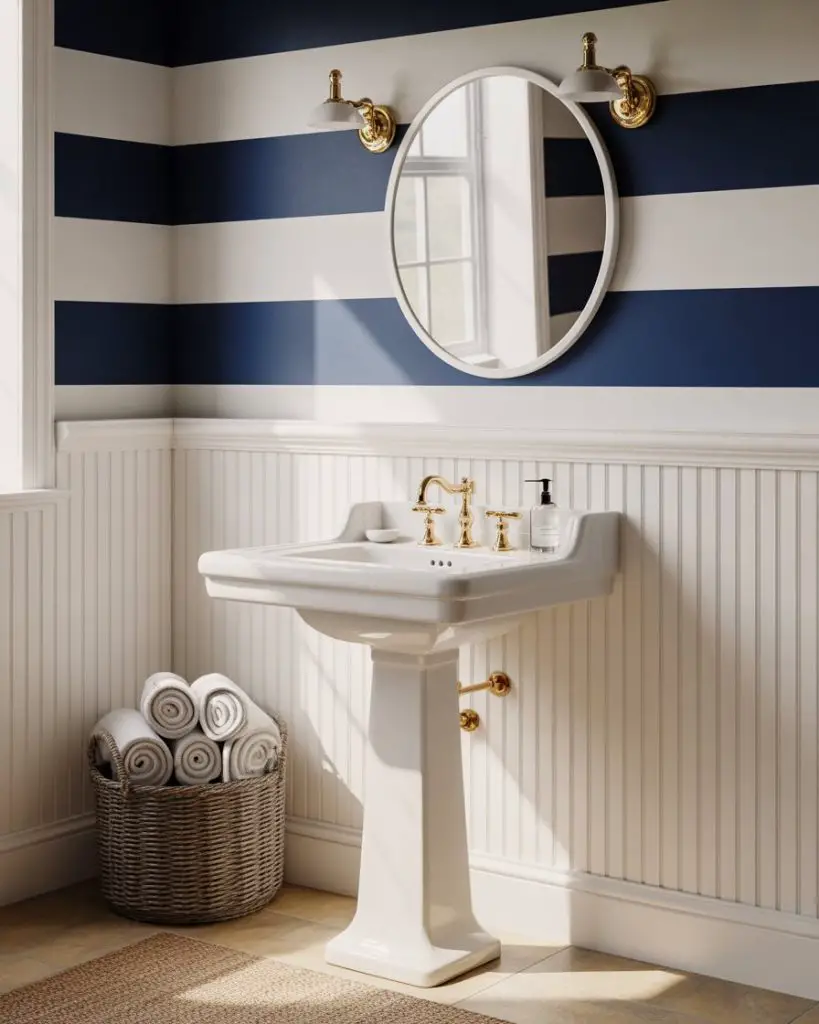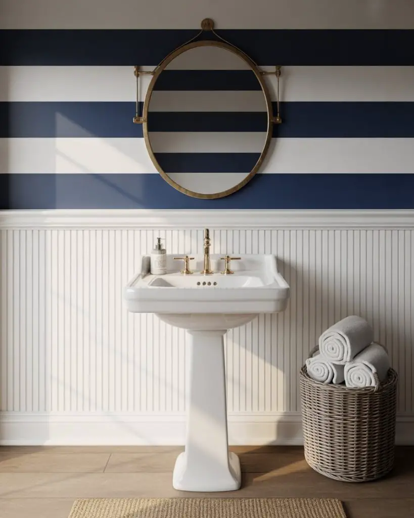 Where it works best: Vacation homes, lake houses, and primary residences in coastal regions where the aesthetic feels authentic rather than forced. The striped pattern adds visual height in rooms with low ceilings, and the navy hides minor splashes and water marks better than pure white. Avoid this look if your home skews rustic or industrial—the preppy vibe will feel disconnected.