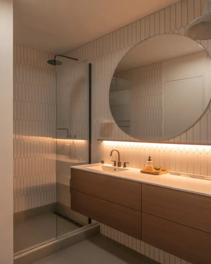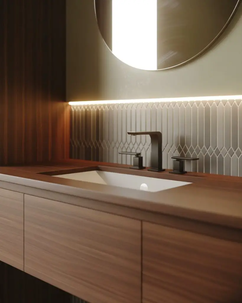 An elegant modern guest bathroom often hinges on the vanity choice, and floating designs deliver clean lines that make even modest spaces feel larger. Choose a sleek wood or lacquered finish, then contrast with a geometric tile backsplash in neutral tones—think hexagons, diamonds, or elongated subway tiles in a herringbone pattern. Undermount sinks keep the look streamlined, while integrated LED lighting beneath the vanity adds a subtle glow that feels both functional and sophisticated.