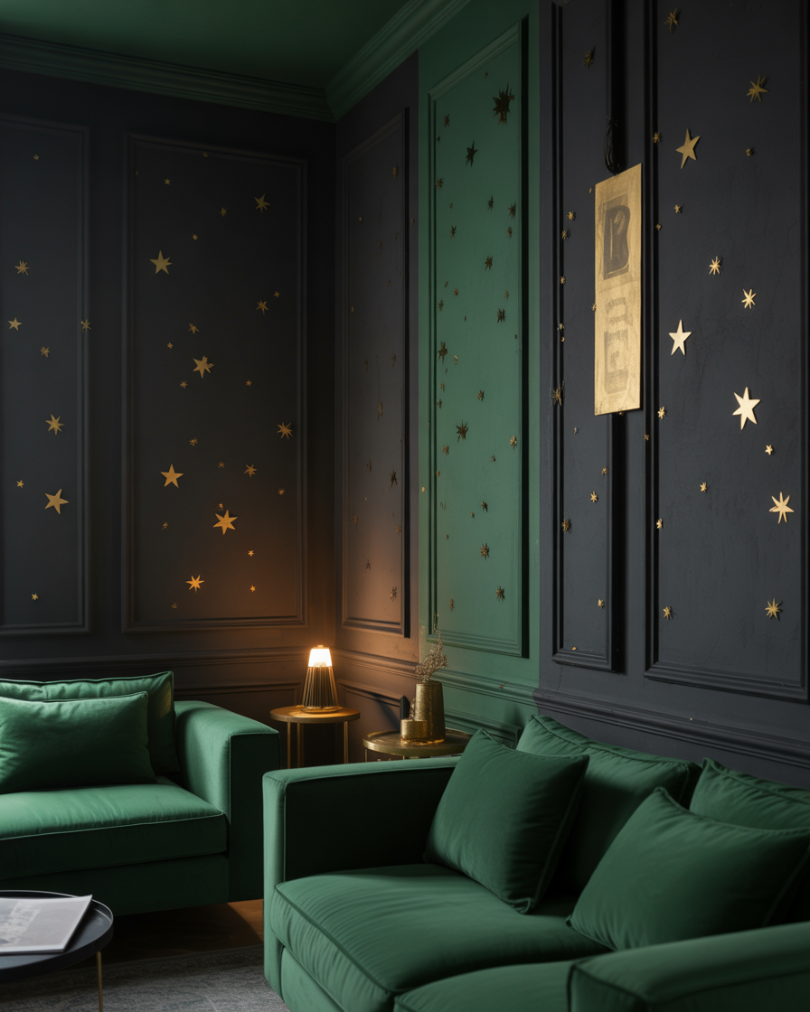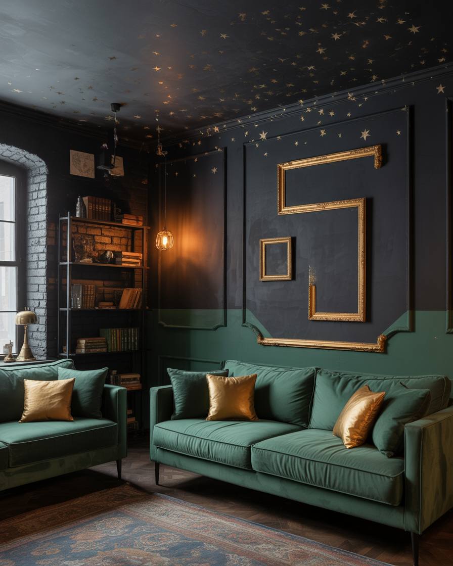 Эстетика «Злой» нашла своё отражение в эстетике лофта. Чёрные стены, окрашенные в тёмно-зелёный цвет, бархатные диваны и наклейки со звёздами — чарующее сочетание. Добавьте золотых акцентов для изюминке — это смело, но стильно и в то же время игриво.