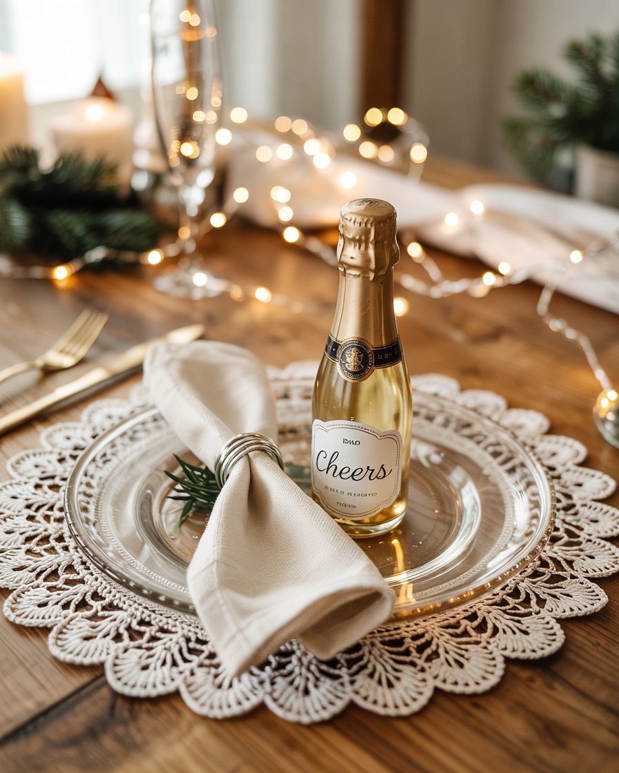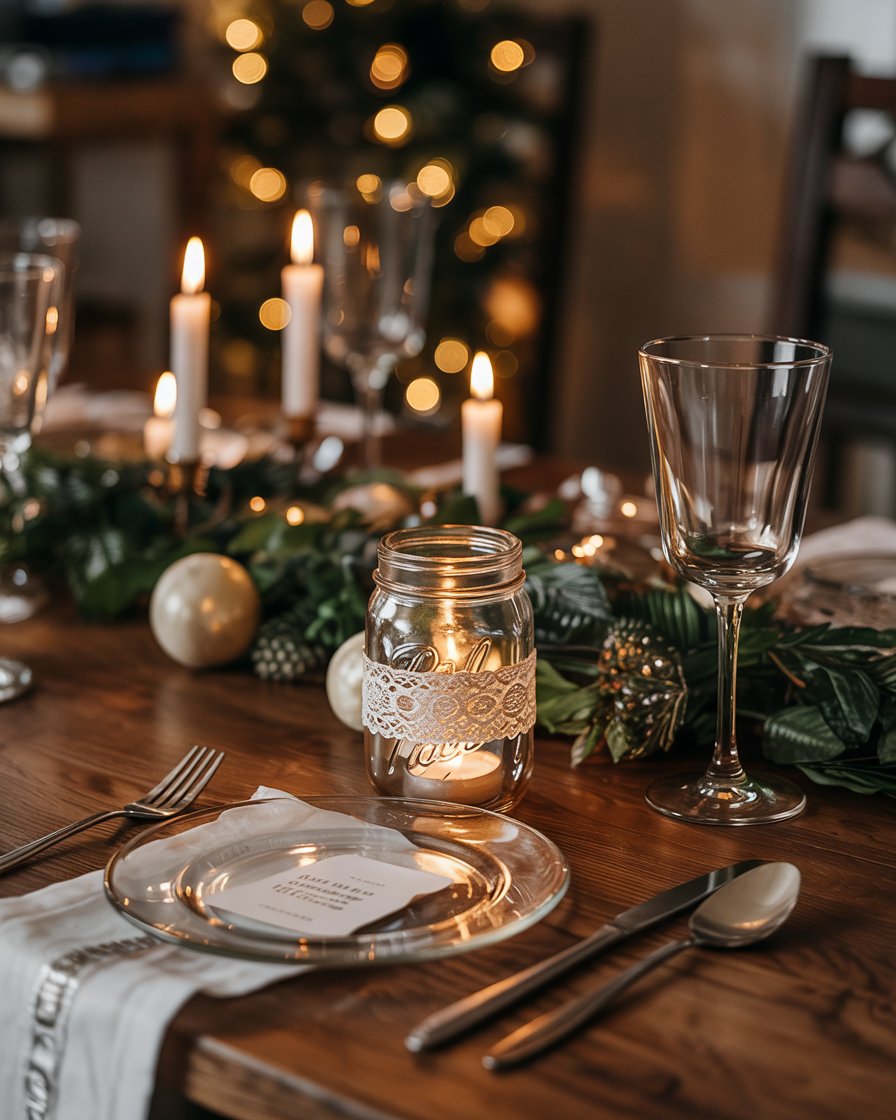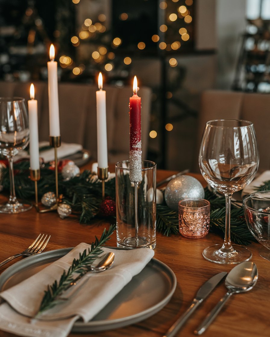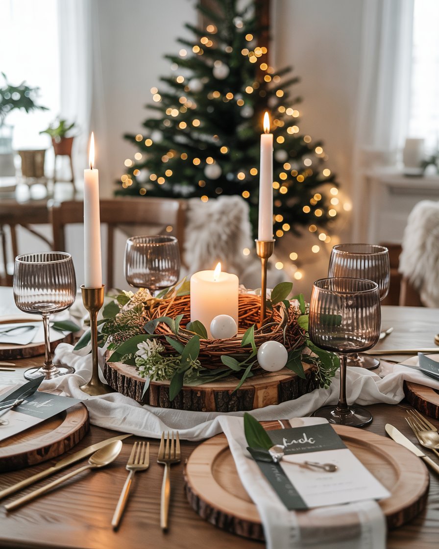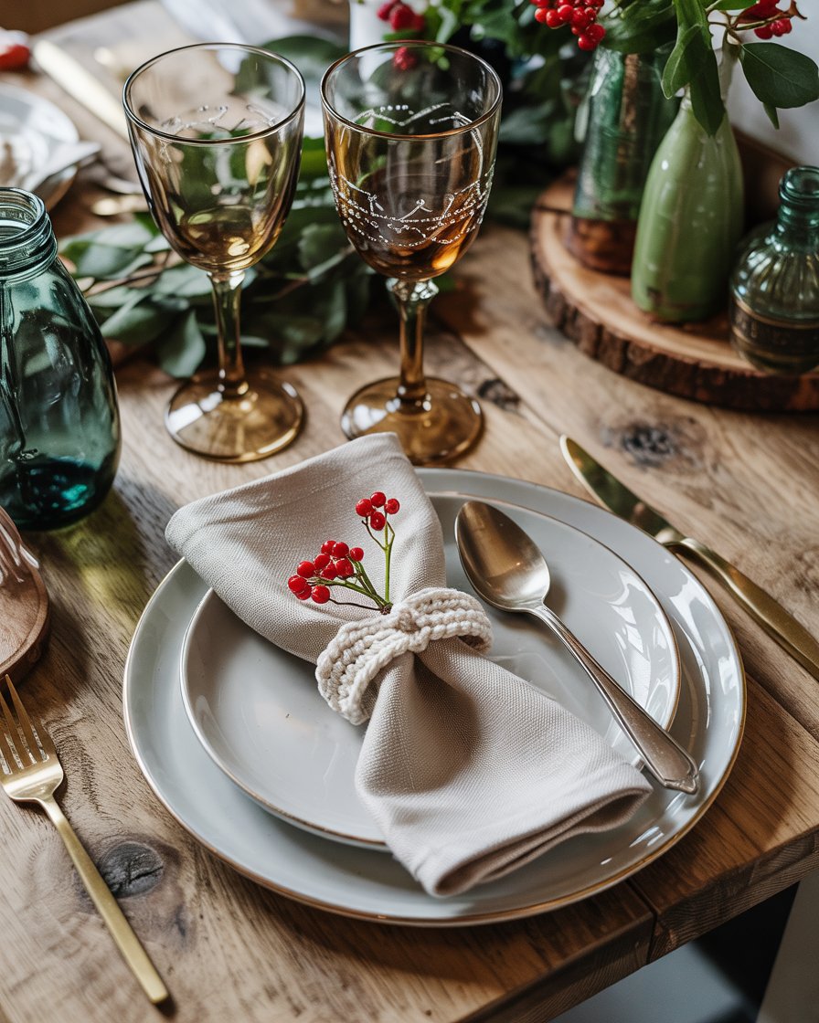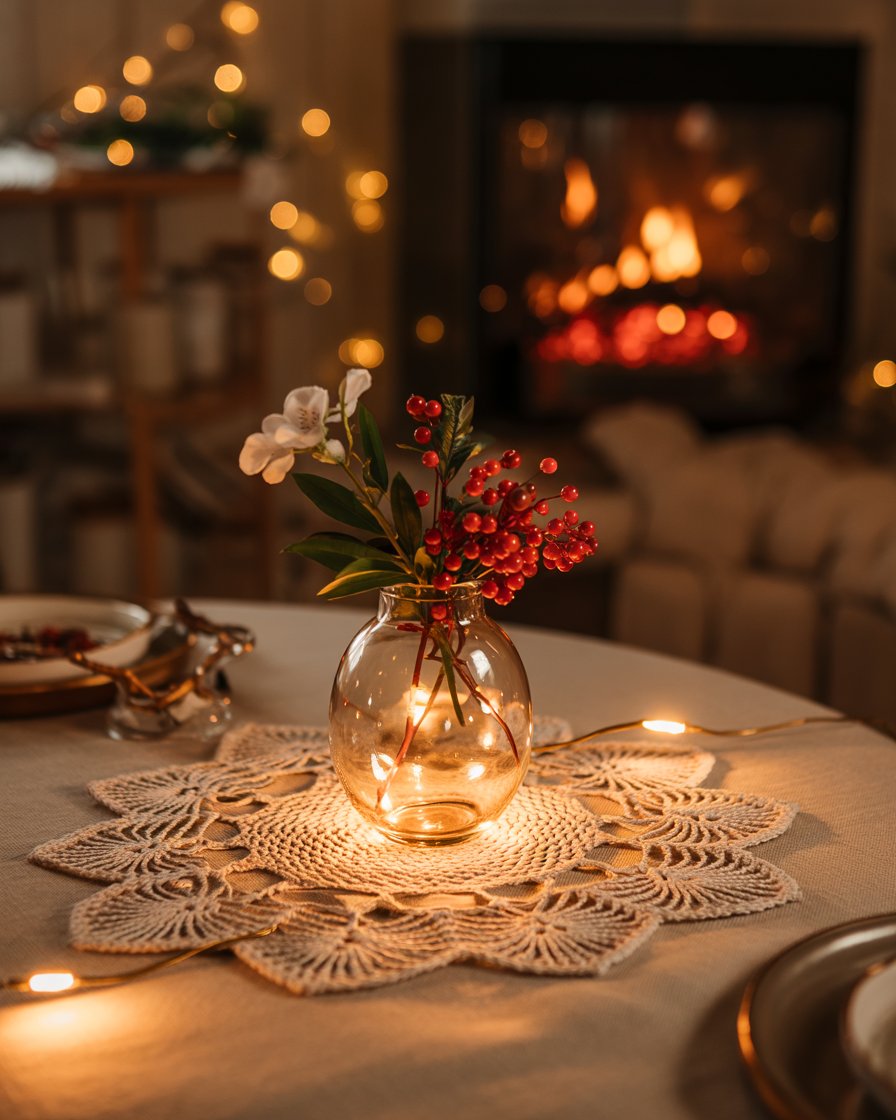 A hybrid design brings together rustic-wood tables with crochet napkin ties, scattering red berries lightly across the centerpiece. It is one of those homemade Christmas-inspired ideas that transition easily into New Year celebrations, giving continuity from one holiday into another while staying uncluttered.