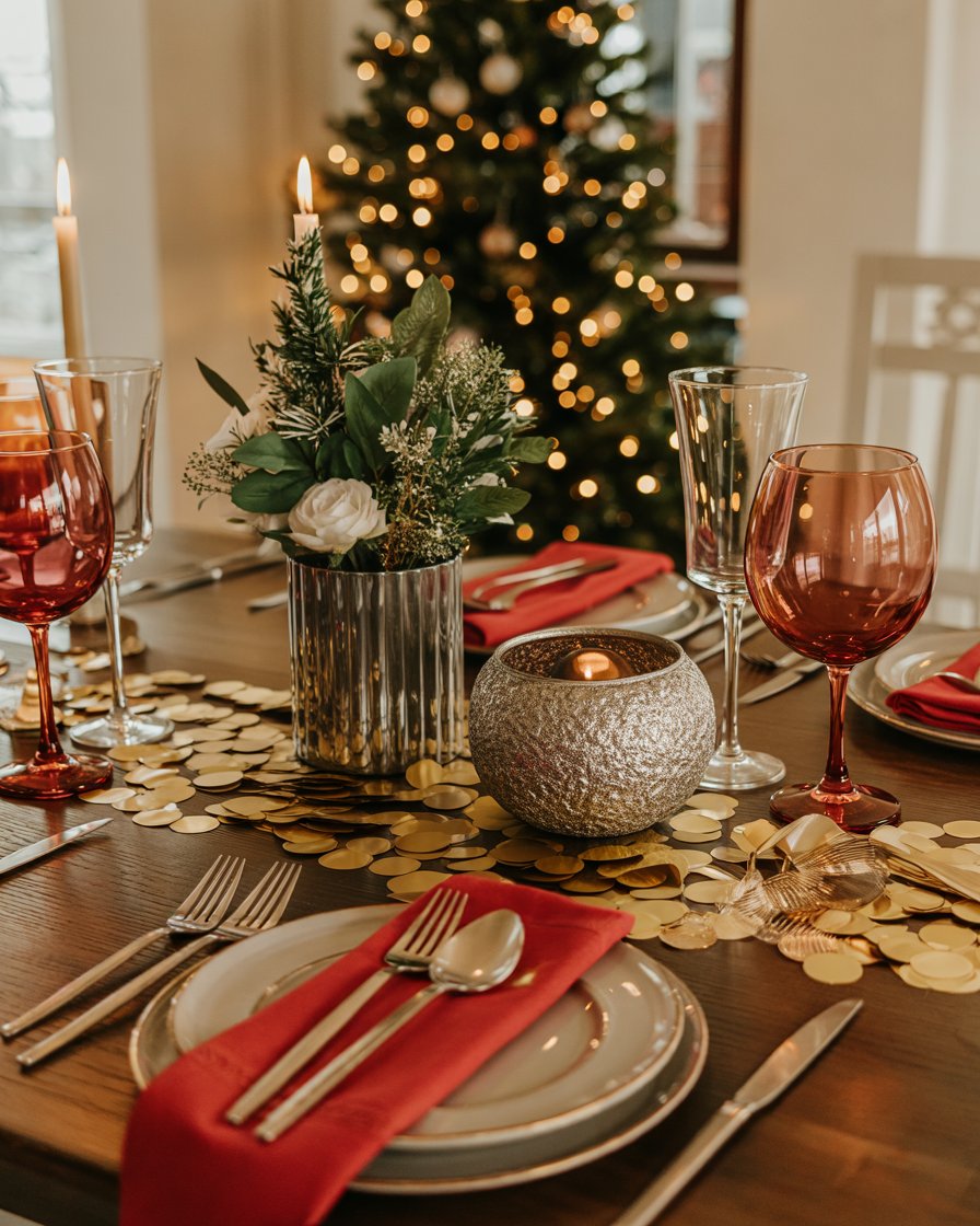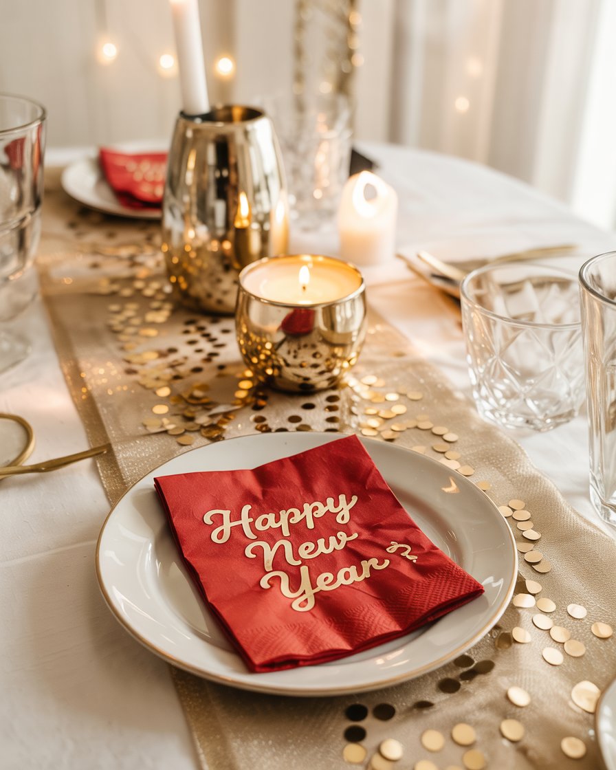 Let go of fabric and instead scatter huge pieces of gold confetti. Combined with silver votives and red napkins, the effect is celebratory and chic. Martha Stewart Living pros often recommend using bold surfaces in place of traditional textiles when the party needs to be unmistakably festive.