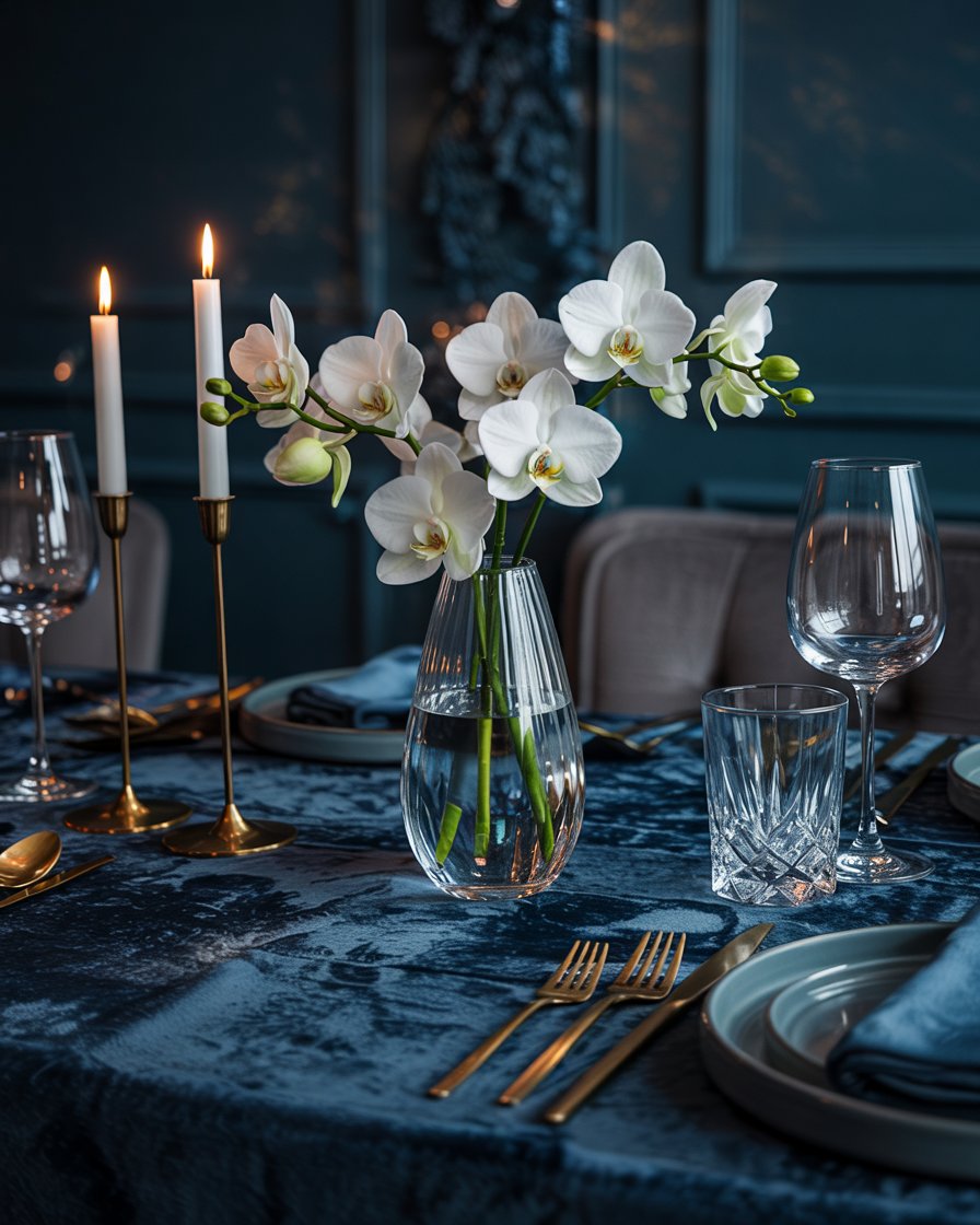 For a dramatic 2025 tablescape, set it with blue velvet tablecloths and crystal glasses with white orchids in slim vases for a wintery touch. Velvet is king now for both wedding receptions and home parties since it speaks richness at once. As design editor Kelly Wearstler shares, texture can set the mood farther than color can.