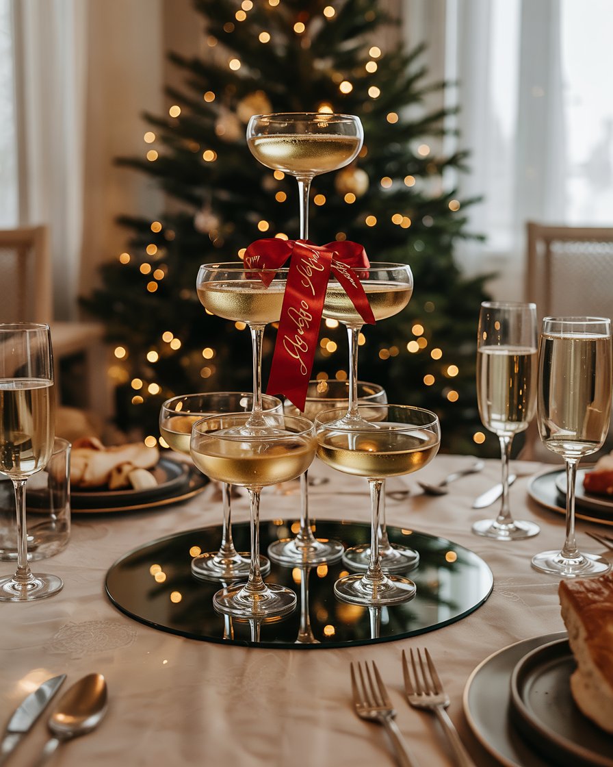 Let the champagne tower be the star of the show, surrounded by mirrored coasters bouncing the sparkle all about. Such a simple decorating idea looks extravagant when tied elegantly with a red ribbon at its base. At midnight, guests will be toasting to this gorgeous display.