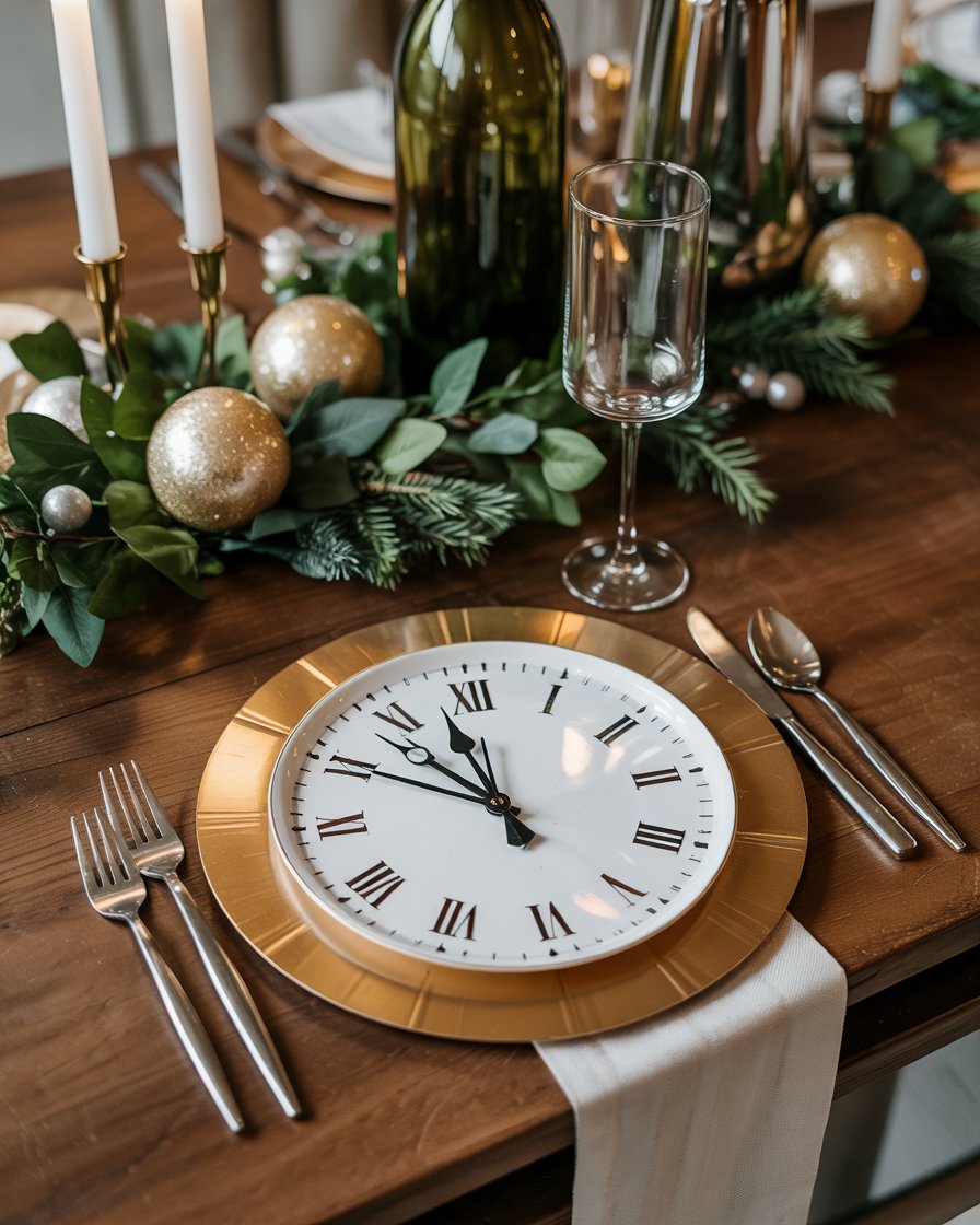 A playful and straightforward route for the crafty: stencil clock faces on round paper chargers. Slide them under white dinner plates, making it look as if each guest is counting down to midnight. It is easy enough that the kids can actually help while still feeling chic enough for the adults.