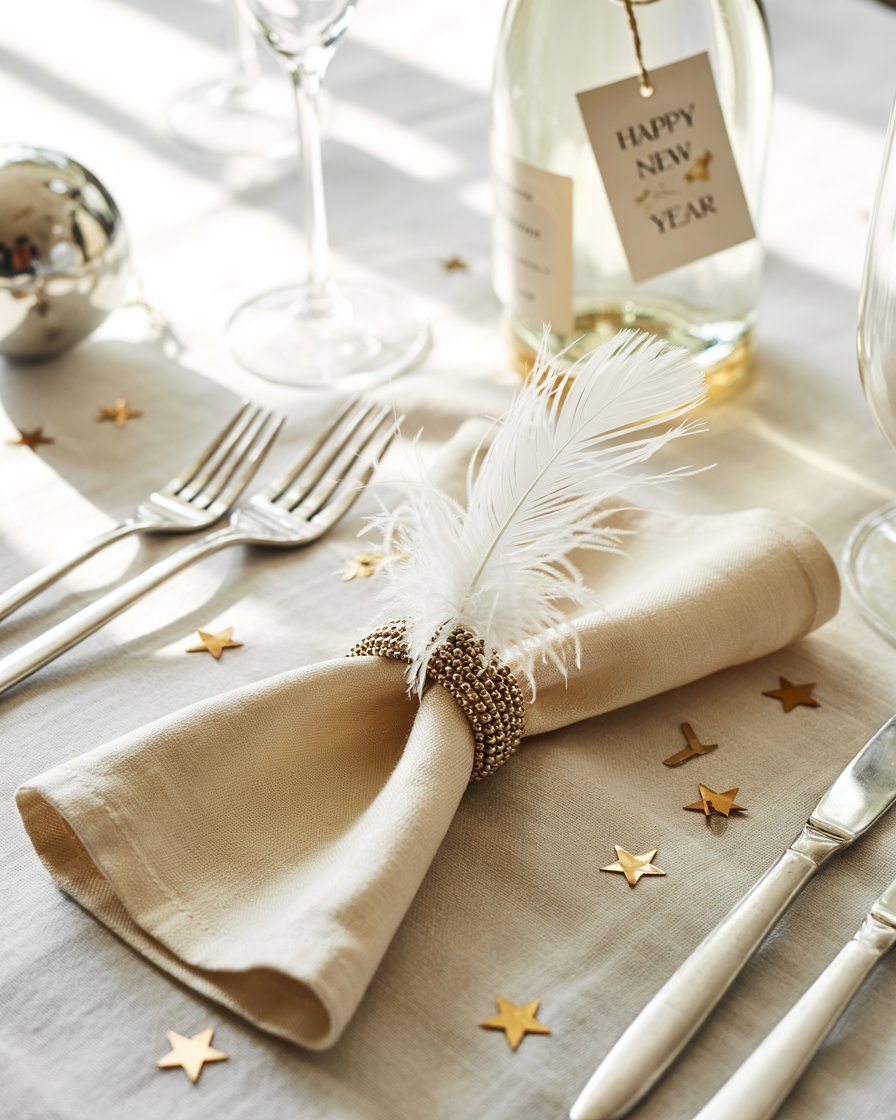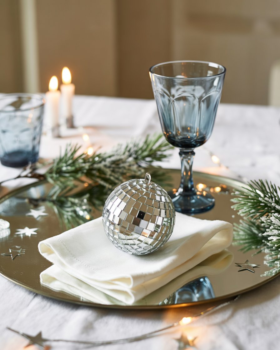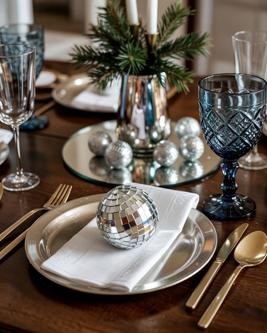 Small silver disco balls as napkin weights instantly add sparkle. Pair with a mirrored tray centerpiece to reflect the shimmer around the table. This look channels retro fun while staying on-trend for 2026, when maximalism is expected to peak.
