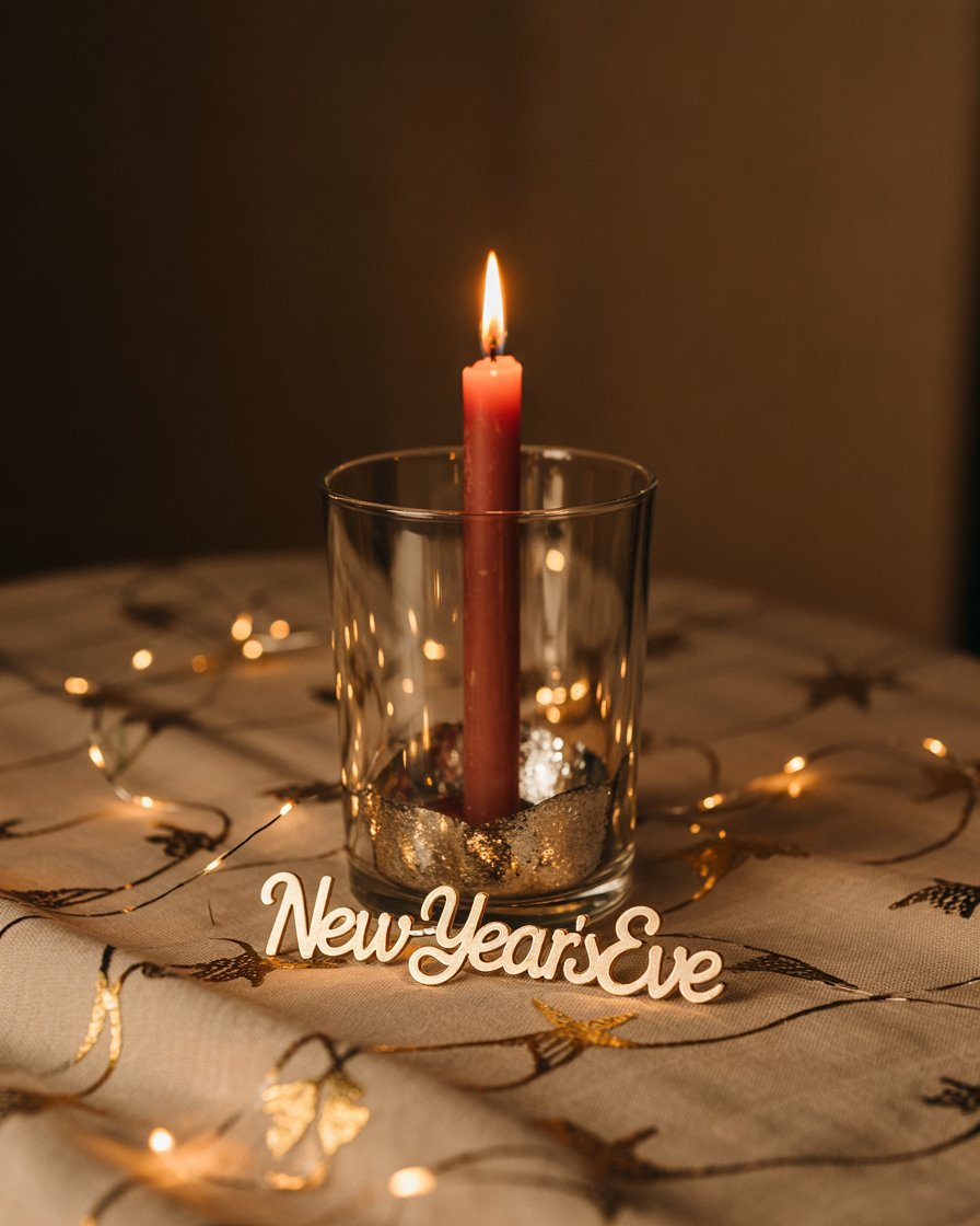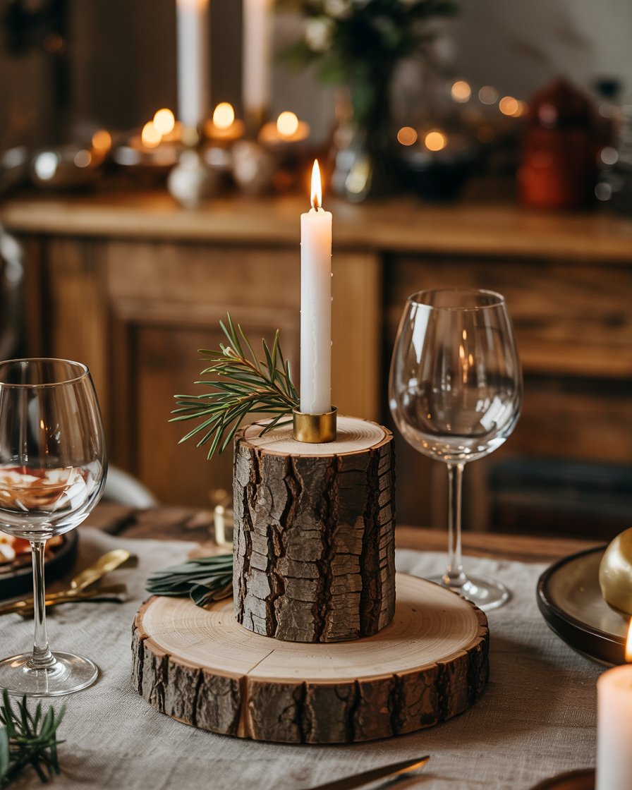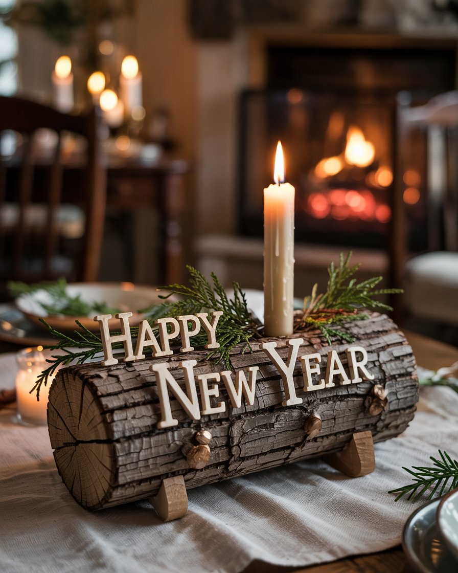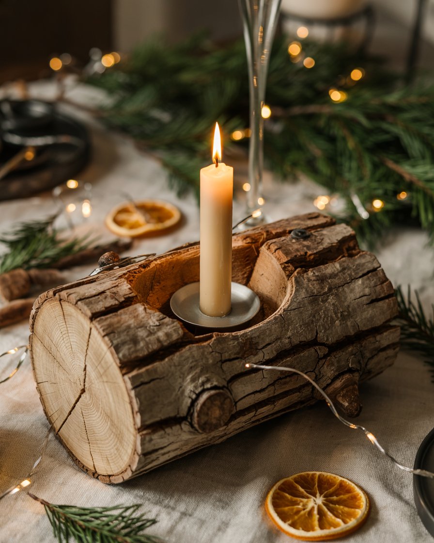 Bring in a rustic vibe by hollowing out a wooden log and filling it with taper candles. Add sprigs of greenery for depth. It’s one of those homemade Christmas-style decorating ideas that transition perfectly into New Year’s Eve without feeling repetitive.