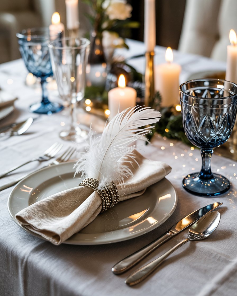 White feathers tucked into napkin folds or lightly scattered across the table evoke a dreamy, celestial feel. Paired with blue crystal glasses, it feels ethereal yet grounded. Designers like Jonathan Adler often use feathers in wedding décor to symbolize lightness and new beginnings.