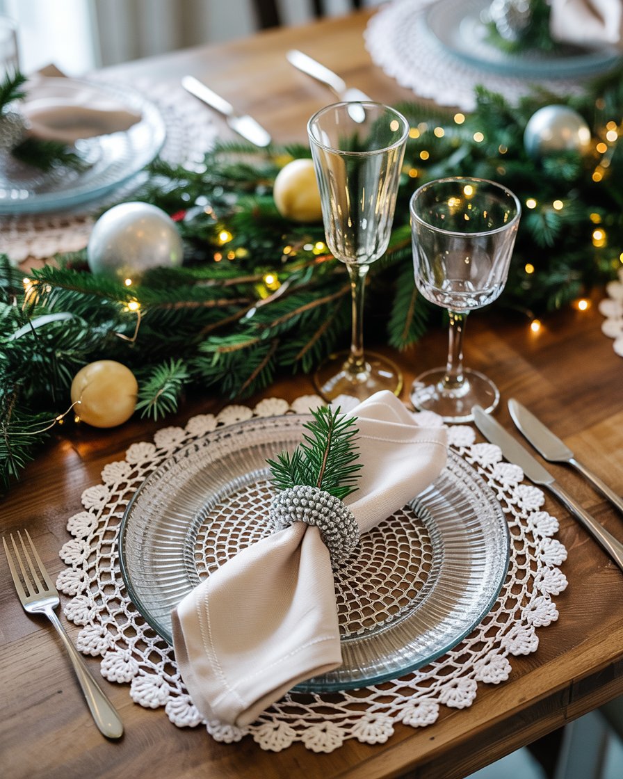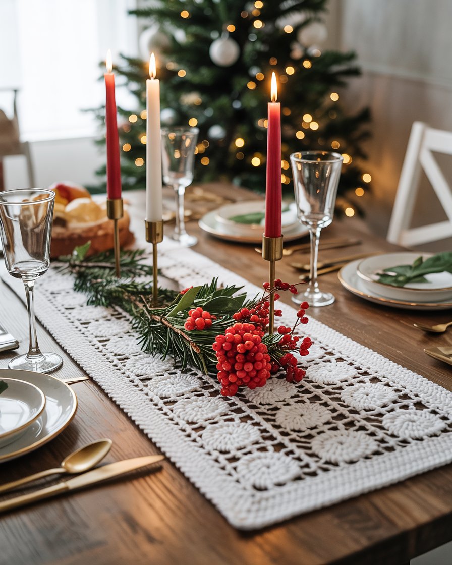Turn crochet into a long centerpiece runner, weaving in sprigs of holly or red berries. The contrast of handmade softness with vivid color looks festive without being over the top. This blend of craft and nature makes for a warm, personal dinner party setting.