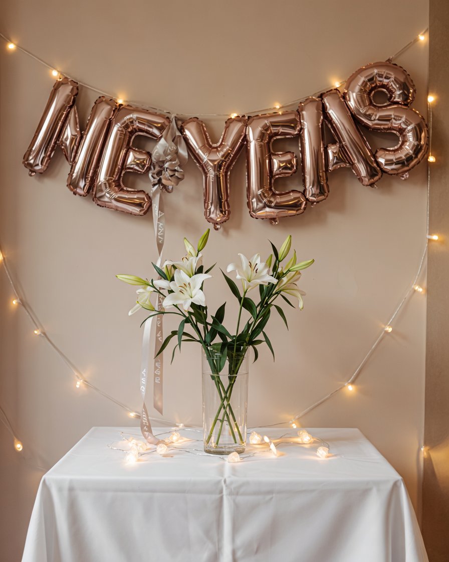 Instead of focusing only on the table surface, style a large balloon garland in metallics to hover above. Tie down strands with ribbon that cascades to the table, blending ceiling decor with tabletop design. Event stylists often call this trick a way to make even small rooms feel grand.