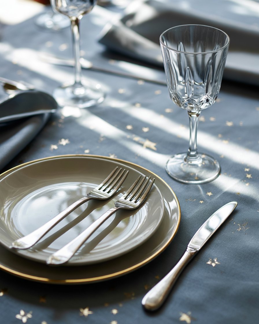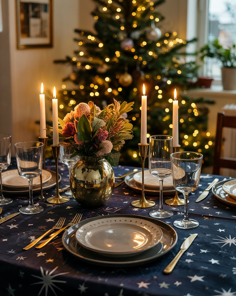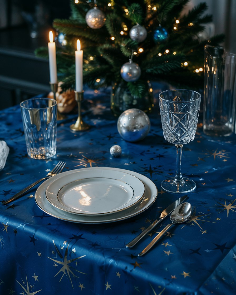 Choose a deep navy blue tablecloth dotted with metallic star prints. Pair with white plates and crystal goblets for a celestial countdown theme. Designers at Apartment Therapy note that galaxy-inspired looks are trending into 2026, especially for parties.