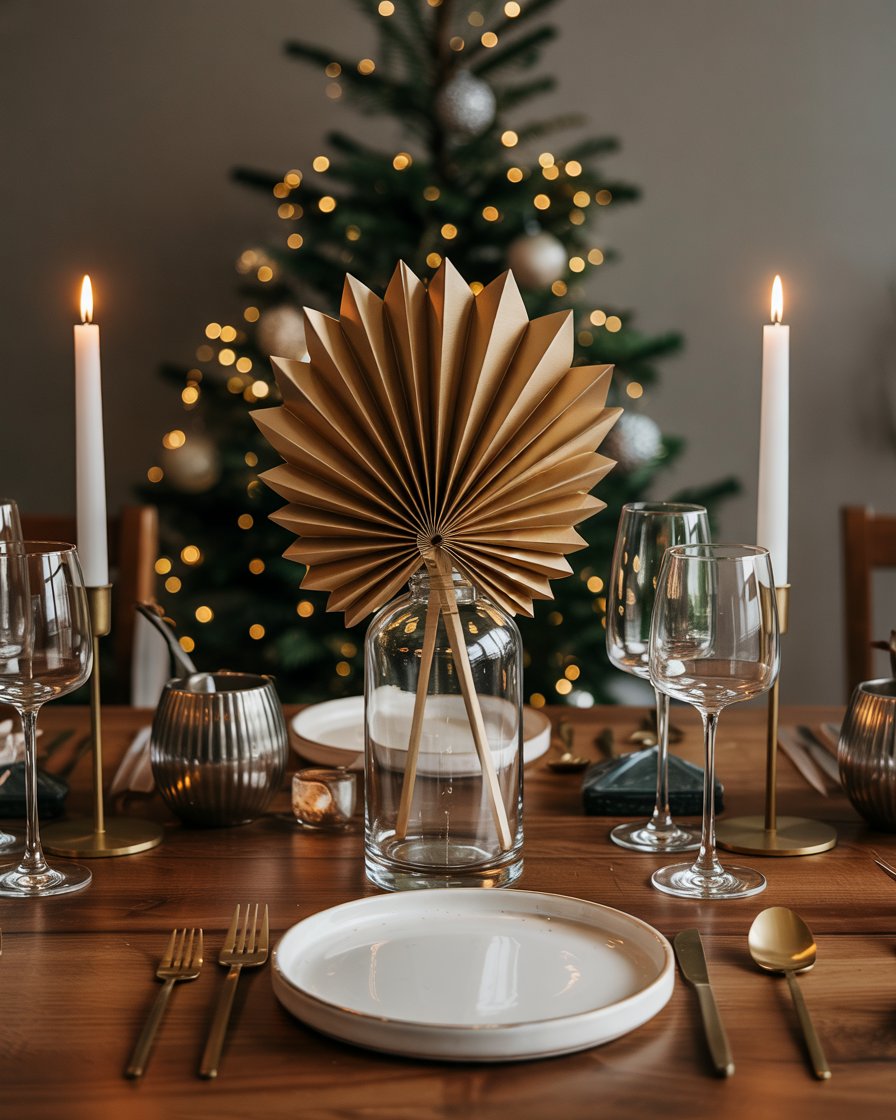 Large folded paper fans in metallic colors make playful, affordable decorations. Arrange them standing upright in vases for a sculptural effect. This is one of those simple decorating ideas guests instantly notice and love to photograph.