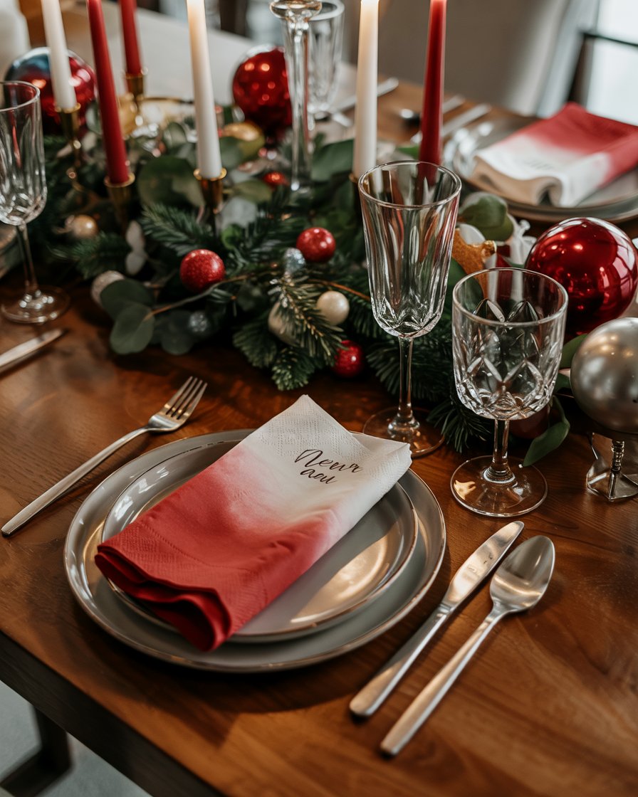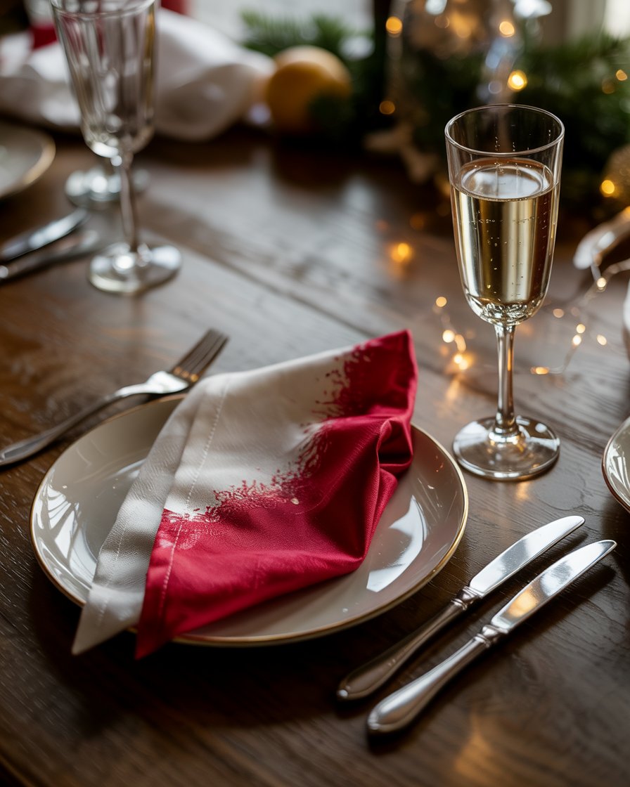 Hand-dye napkins from white to red for a bold gradient. Fold simply and pair with clear glassware so the linens stand out. This homemade Christmas-inspired trick gives a personal yet stylish feel, ideal for gatherings where details make the party.