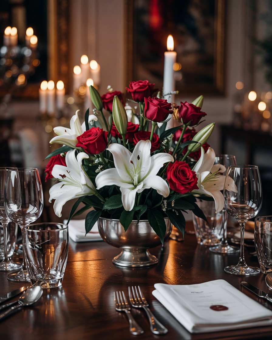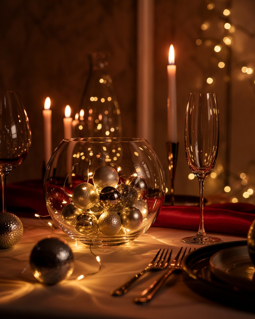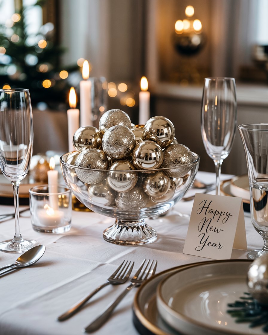 Instead of flowers, fill a crystal bowl with silver ornaments for a sparkling centerpiece. The reflection of candlelight on the ornaments creates a festive glow. This is especially appealing for January gatherings, carrying the holiday mood into the new year.