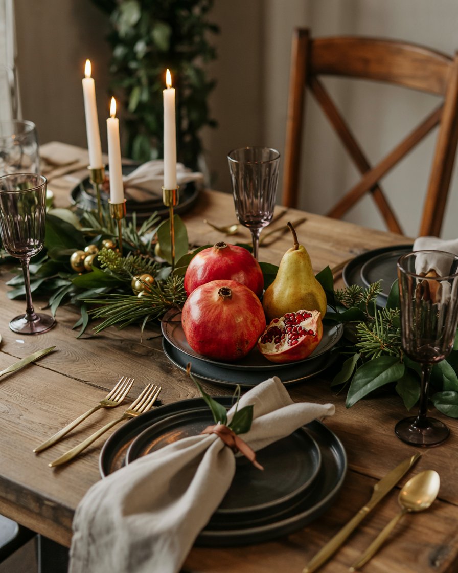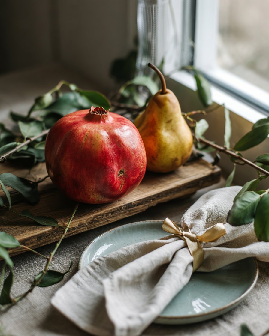 Bring in a rustic feel by using pomegranates and pears as part of the centerpiece. Their natural color pops against neutral linens, and the fruit doubles as a nod to abundance. Many wedding planners encourage edible decor for sustainability.