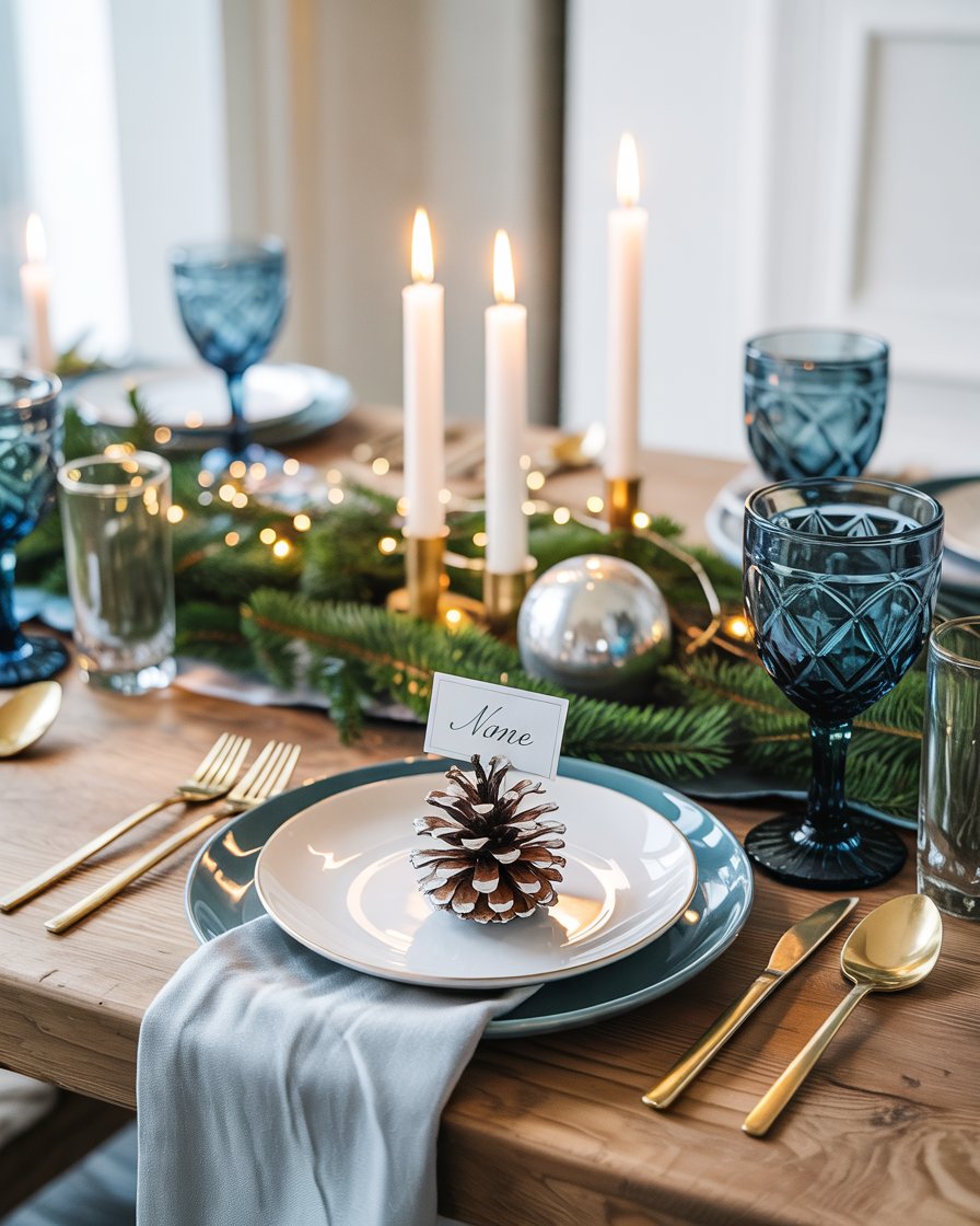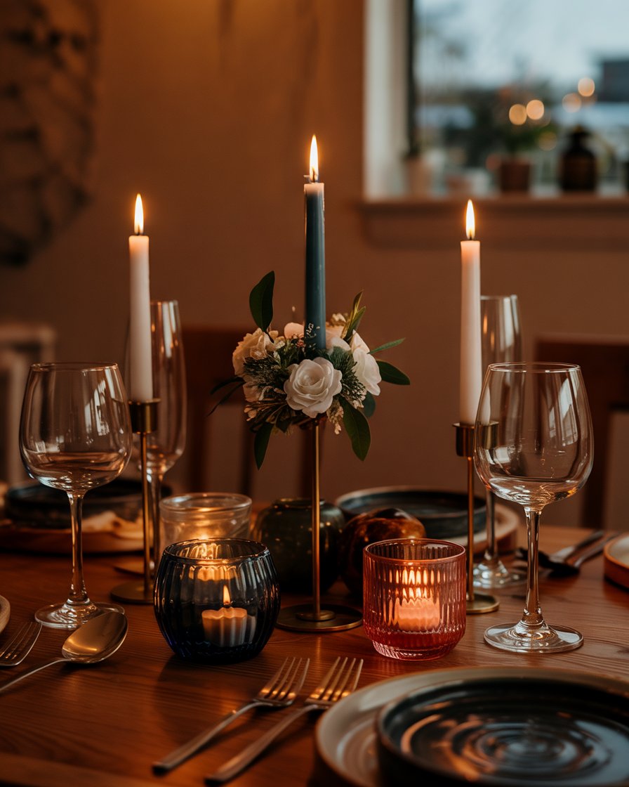 Add height and glow with blue glass candleholders at intervals down the table. Paired with white plates and a mirrored runner, the light reflection feels sophisticated. It’s a simple but highly effective way to play with color.